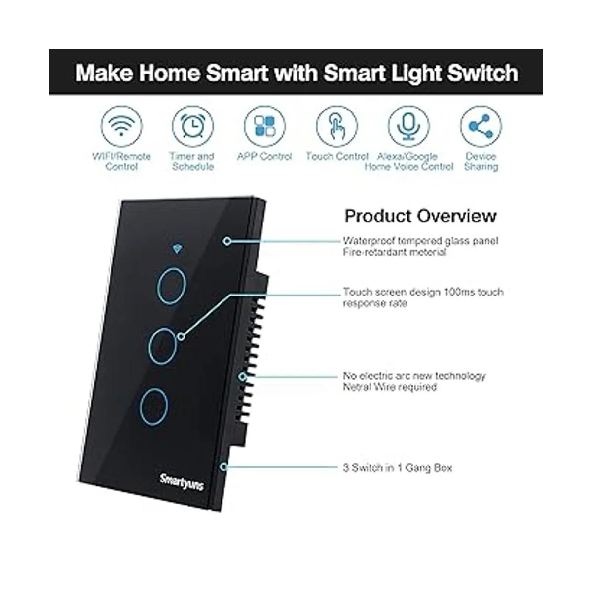 Smartyuns Interruptor de luz inteligente WiFi negro, interruptor de luz táctil con indicador LED, interruptor de pared estándar de EE. UU. compatible con Alexa, Google Assistant, aplicación SmartLife interruptor de luz de 3 bandas, negro