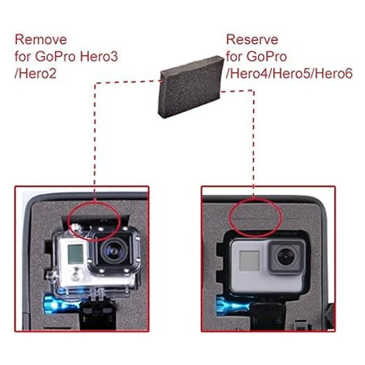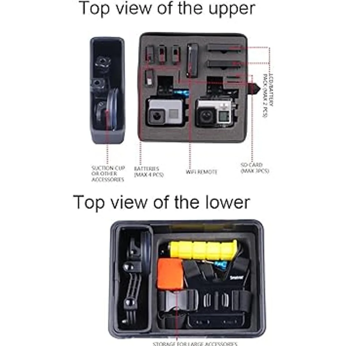 La funda de doble capa con una ranura grande es perfecta para cámaras GoPro y accesorios como ventosas, agarre de mango flotante, correa de cabeza o cinturón de correa de pecho, etc. Cámara y accesorios no incluidos.