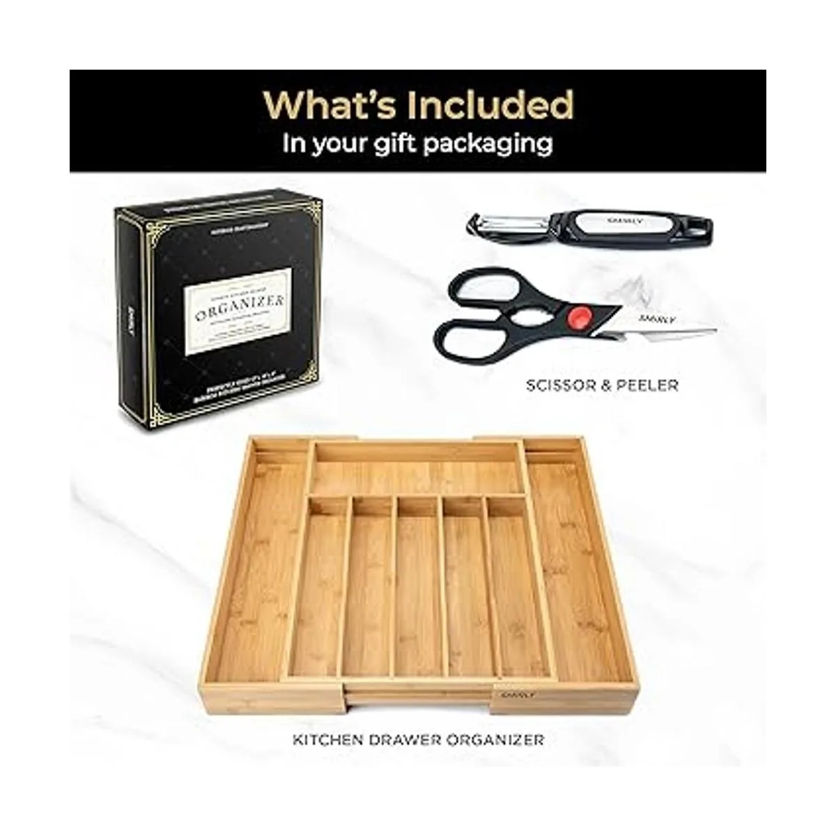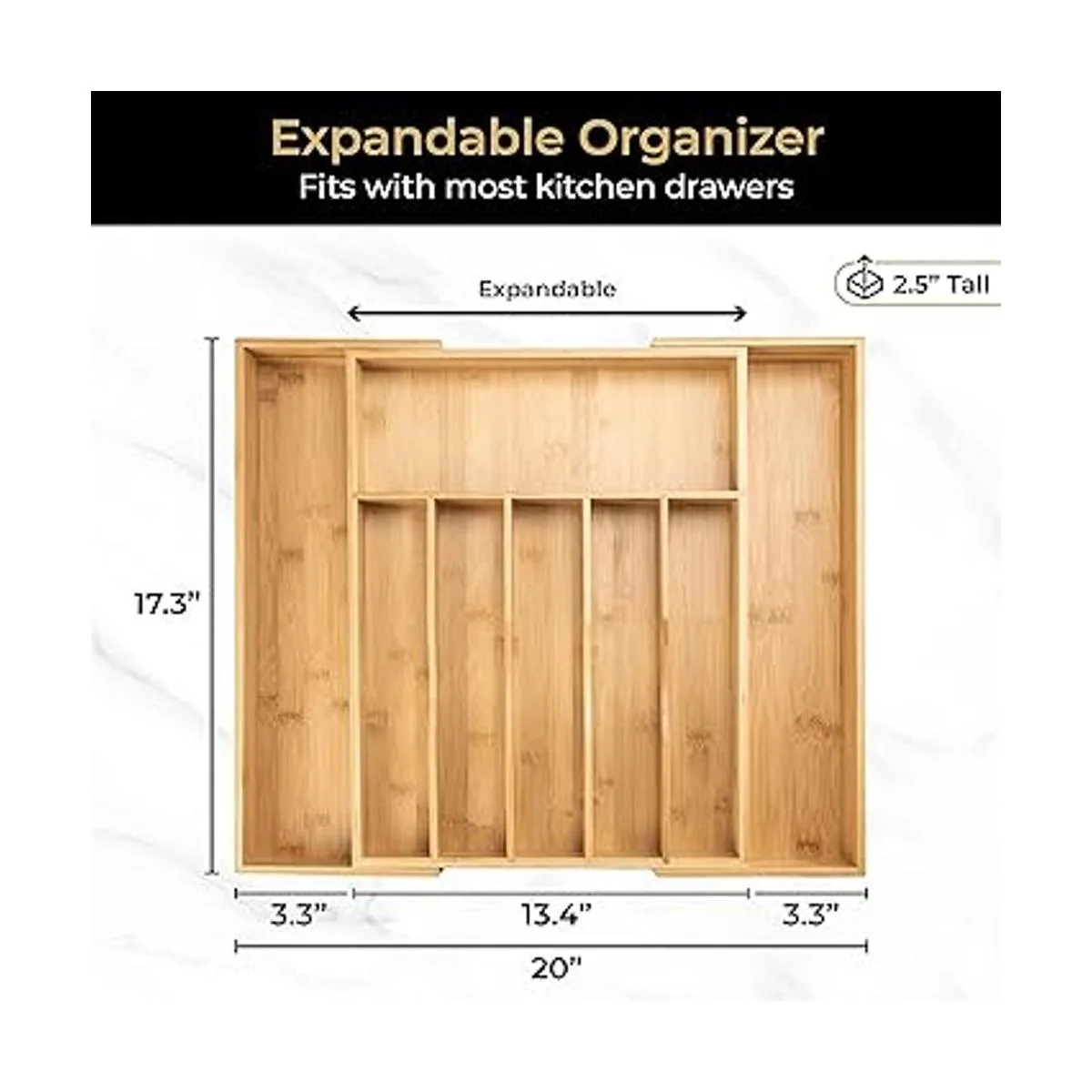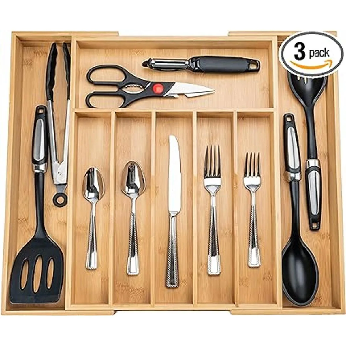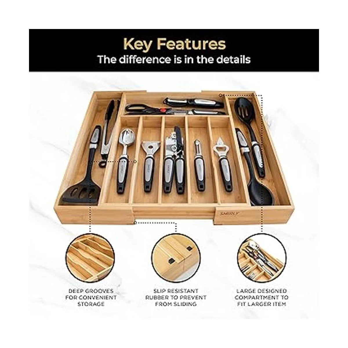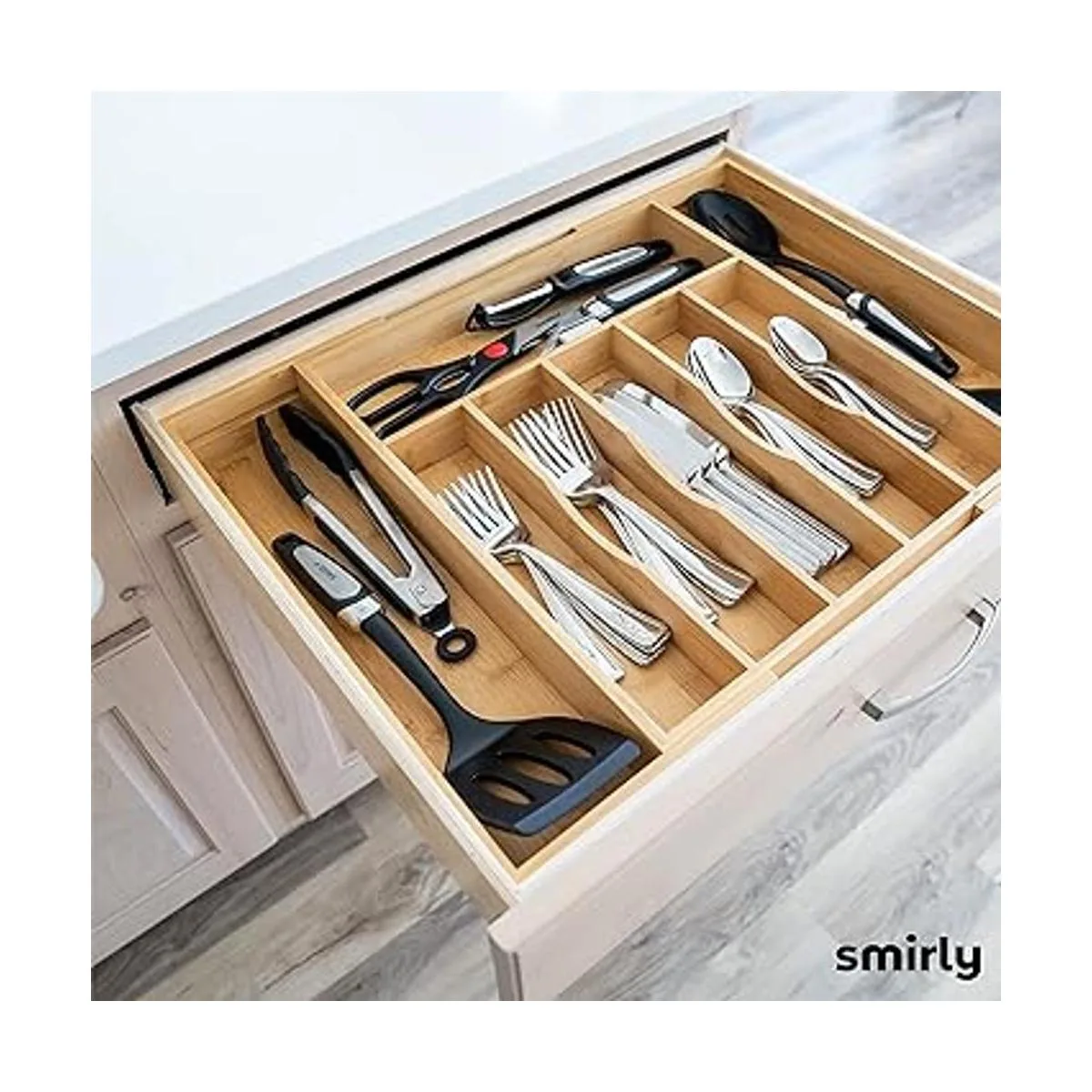 SMIRLY Organizador de cubiertos de bambú para cajón, organizador de cajones de cocina, organizador de utensilios de cocina para cajones de cocina, bandeja de cubiertos para cajón, organizador de cubiertos y cubiertos en cajón