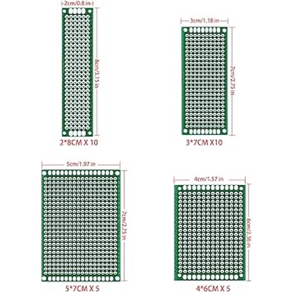 Selección de tableros Proto de varios tamaños: 30 tableros de prototipo de doble cara de 4 tamaños diferentes para satisfacer tus demandas al diseñar tus propios kits Arduino, experimentos electrónicos y proyectos de bricolaje. 10 piezas de 0.8 x 3.1 in, 10 piezas de 1.2 x 2.8 in, 5 piezas de 1.6 x 2.4 in y 5 placas PCB de 2.0 x 2.8 in