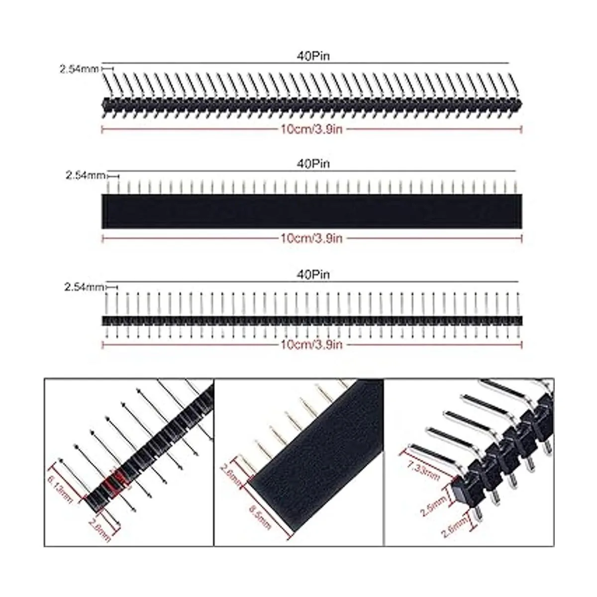 Conector de cabecera: 10 cabezales macho de 40 pines, 10 cabezales macho de ángulo recto de 40 pines, 10 cabezales hembra de 40 pines; paso: 0.100 in, una sola fila y conector recto
