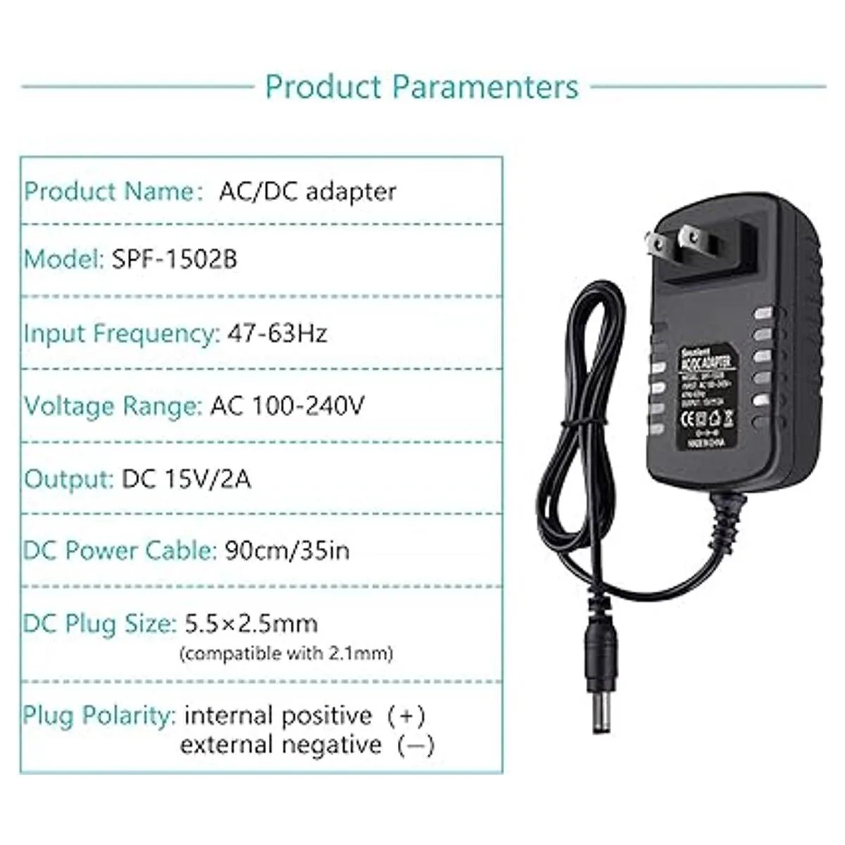Adaptador de CA de 15 V 2 A. Parámetros: entrada de CA 100240 V 50/60 Hz; salida CC 15 V 2 A, entrada de voltaje amplio compatible: si la corriente de tu dispositivo es inferior a 2 A, entonces este será un buen sustituto, compatible con 1 A/1.2 A/1.5 A/1.8 A o menos dispositivo de corriente, solo se adapta a dispositivos de 15 voltios