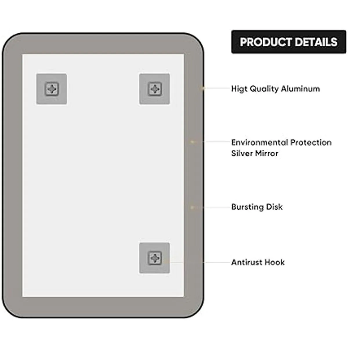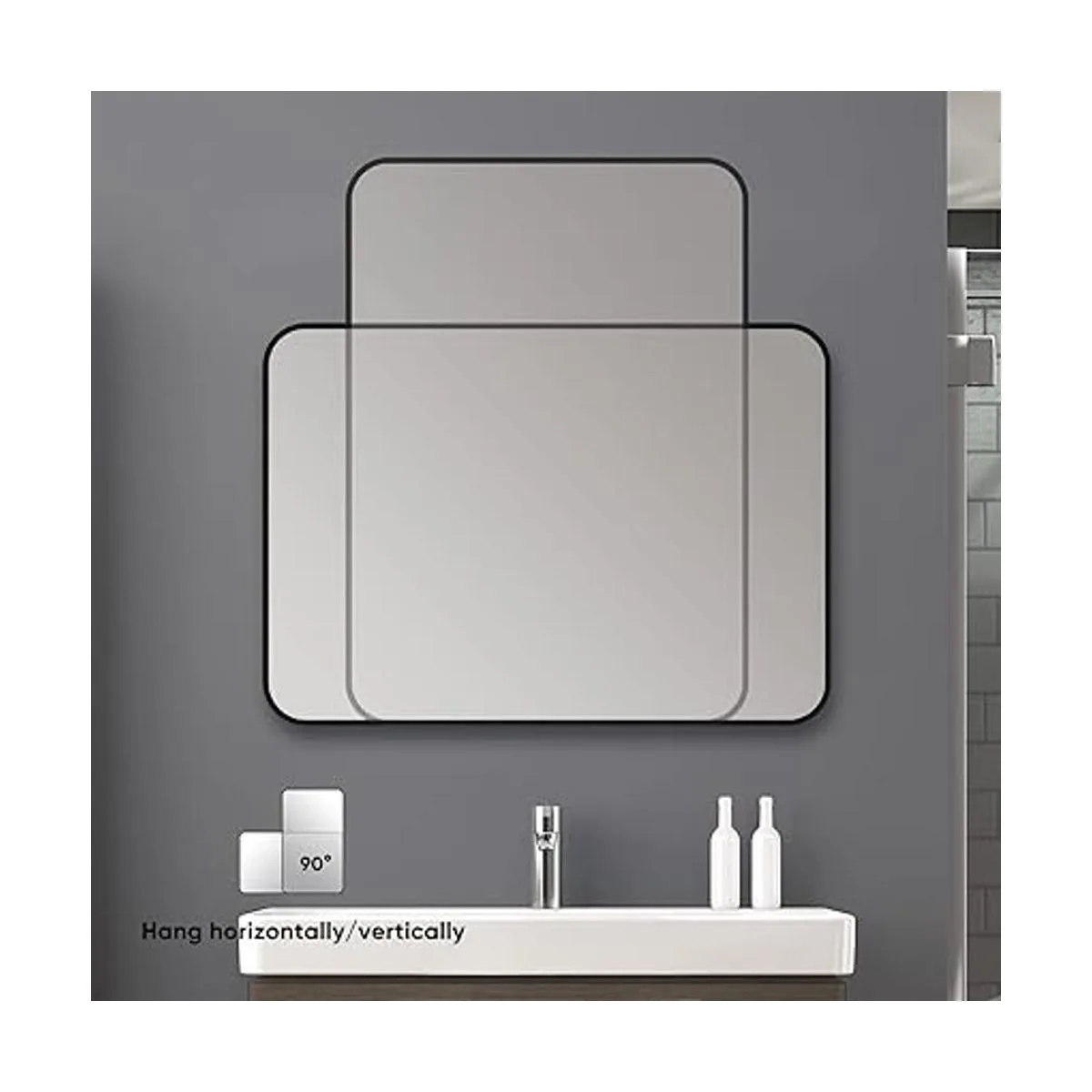 Embalaje y accesorios: el embalaje del espejo de tocador de pared mejorado para el baño protege mucho mejor tanto las esquinas del espejo como tanto la parte delantera como la trasera del espejo. Ha pasado todas las pruebas, incluyendo pruebas de caída, impacto y presión pesada.
