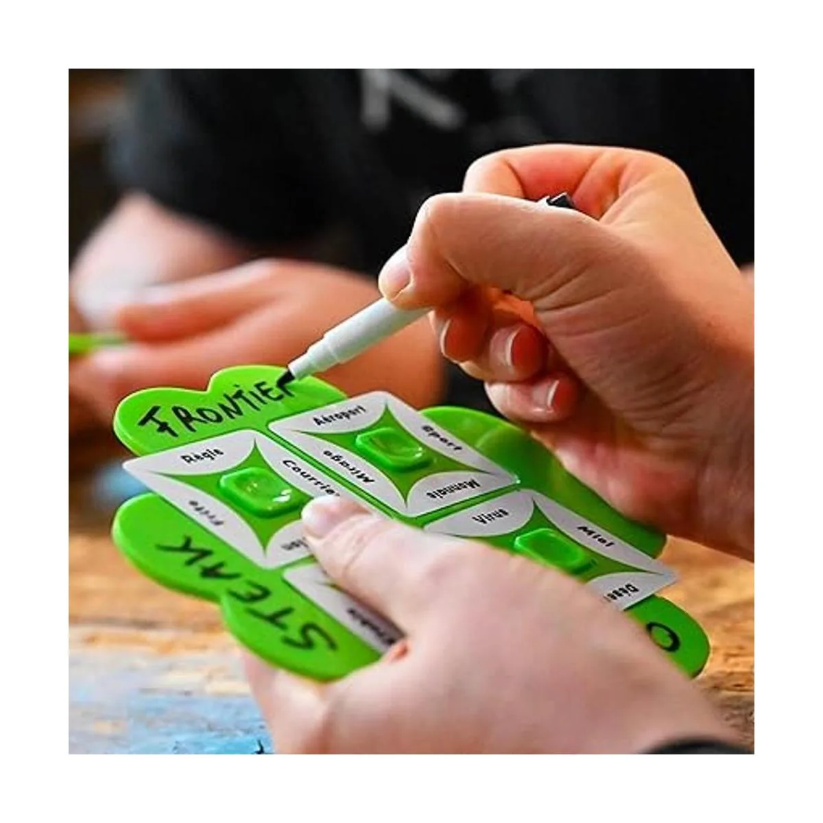 Juego de asociación de palabras: en este juego interactivo de adivinaciones, los jugadores reciben palabras clave y escriben secretamente sus características comunes en su tablero de trébol para formar pistas. Luego, deben trabajar juntos para tratar de averiguar las palabras clave de cada jugador.