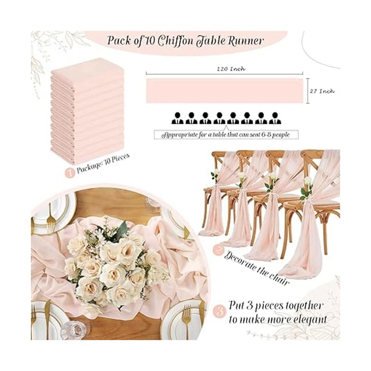Material: todos los bordes están acabados con costuras agradables, tela drapeada aireada y ligera, 10 caminos de mesa de comedor suficientes para decorar tus mesas y sillas de boda. Haz que tu mesa de eventos sea más elegante.
