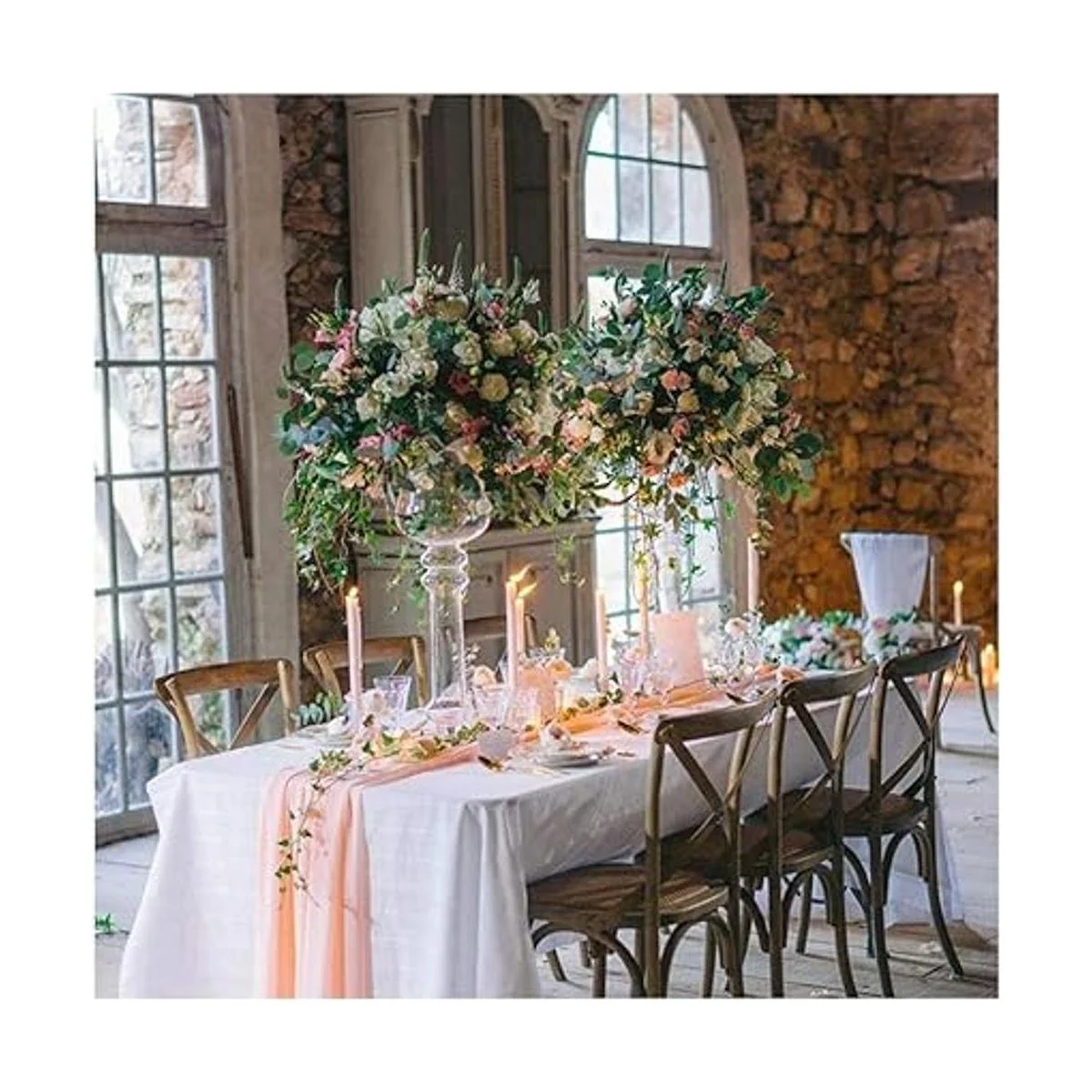 Escenas aplicables: el camino de mesa de 10 pies de largo se puede utilizar para un centro de mesa, camino de pasillo, decoración de silla, guirnalda de arco de boda, guirnaldas de mesa de cenefa, camino de mesa de bufanda transparente, pasarela de boda al aire libre al escenario.