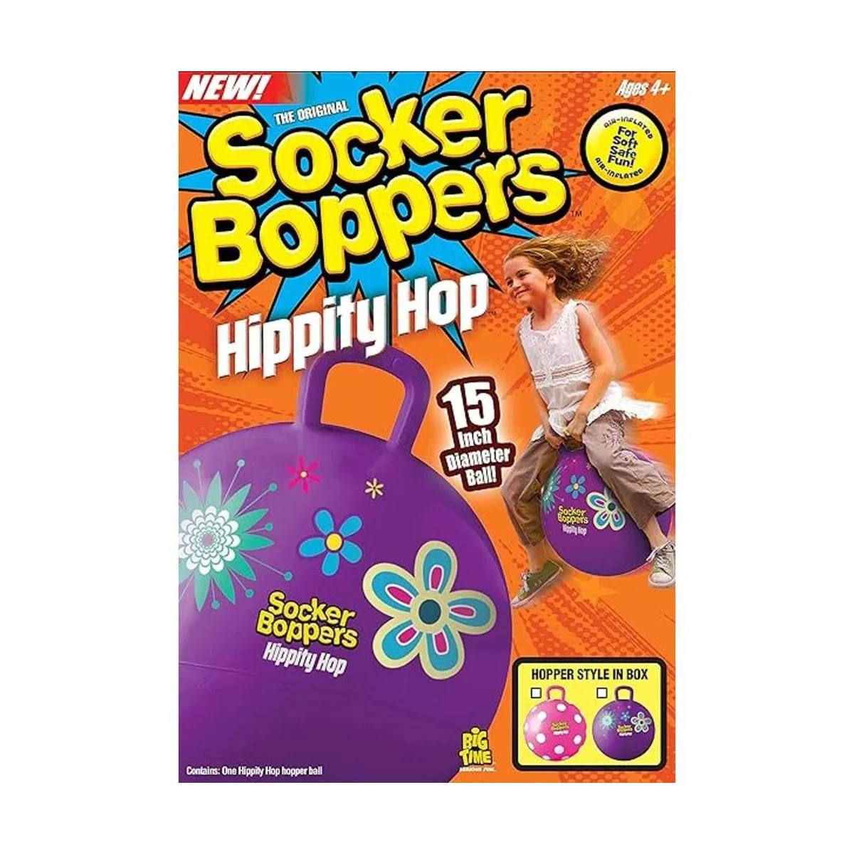 Socker Boppers Hippity Hopper Ball, balón inflable de 15 pulgadas para niños, pelota de fútbol, diversión en interiores y exteriores, vinilo duradero de calibre pesado, mango de agarre EZ, promueve el equilibrio, la fuerza de coordinación