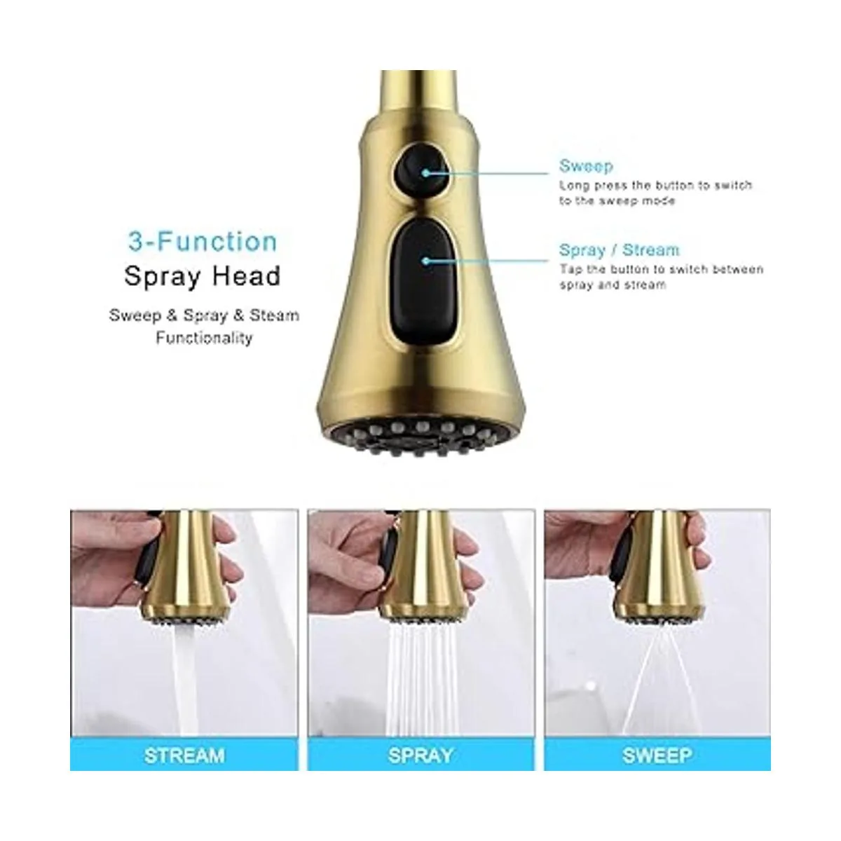 Tres modos de trabajo y cabezal de rociador extraíble: nuestro grifo de cocina con 3 ajustes de flujo chorro/pulverizador/barrida, flujo para llenar de agua, rocía para un lavado de limpieza fuerte, potente cuchilla de barrido para limpiar platos. El cabezal pulverizador para grifo de cocina es de ABS Neoperl que se puede quitar con una moneda fácilmente para limpiar y reemplazar.