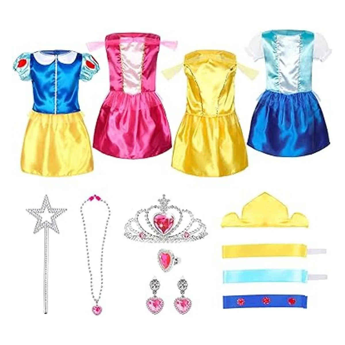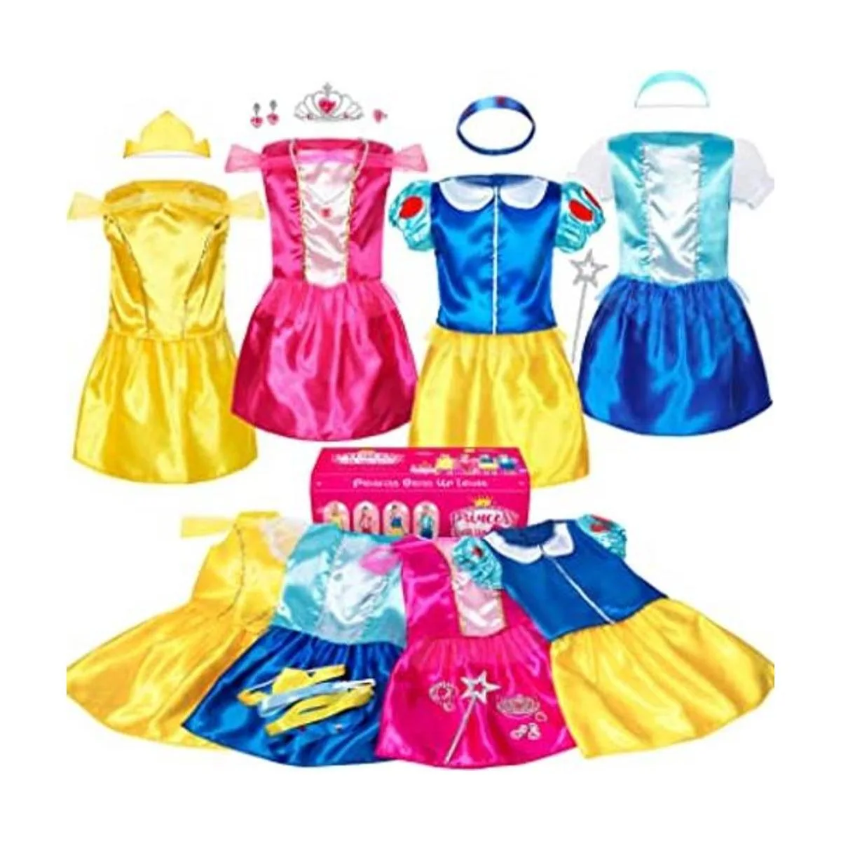 Gran valor para una variedad de disfraces: diferentes trajes de princesa representan cuatro princesas diferentes, el rosa es dulce y entusiasta, el azul es suave y valiente, el amarillo es inteligente e independiente, el azul y el amarillo representan hermoso y amable. A las niñas les encanta vestirse tantas opciones diferentes.