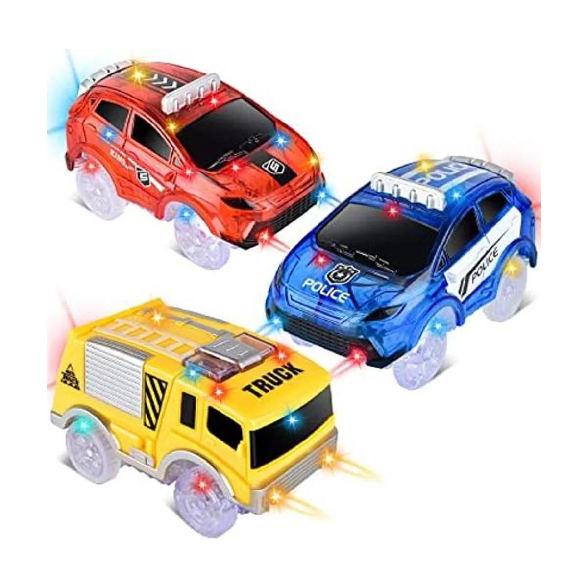 Solo repuesto de autos de juguete iluminados con 5 luces LED intermitentes, accesorios de pista de automóvil compatibles con pistas mágicas y pistas con la mayoría de autos de pista para niños y niñas paquete de 3