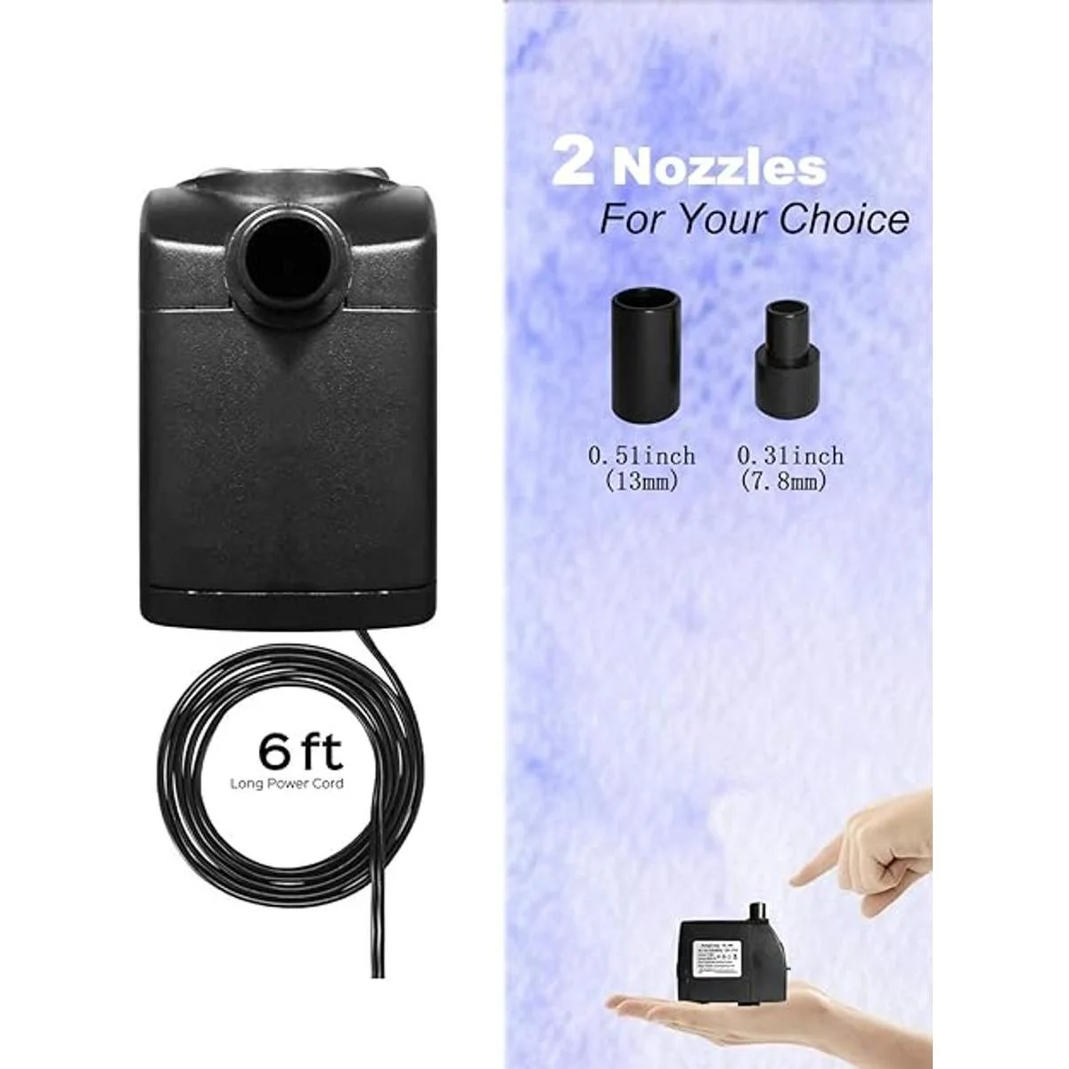 2 boquillas: la bomba de agua SongLong viene con 2 boquillas, 0.31 pulgadas, 0.51 pulgadas, proporciona un flujo de agua diferente como necesites. Los accesorios roscados hacen que sea más estable. Desmontable y lavable.