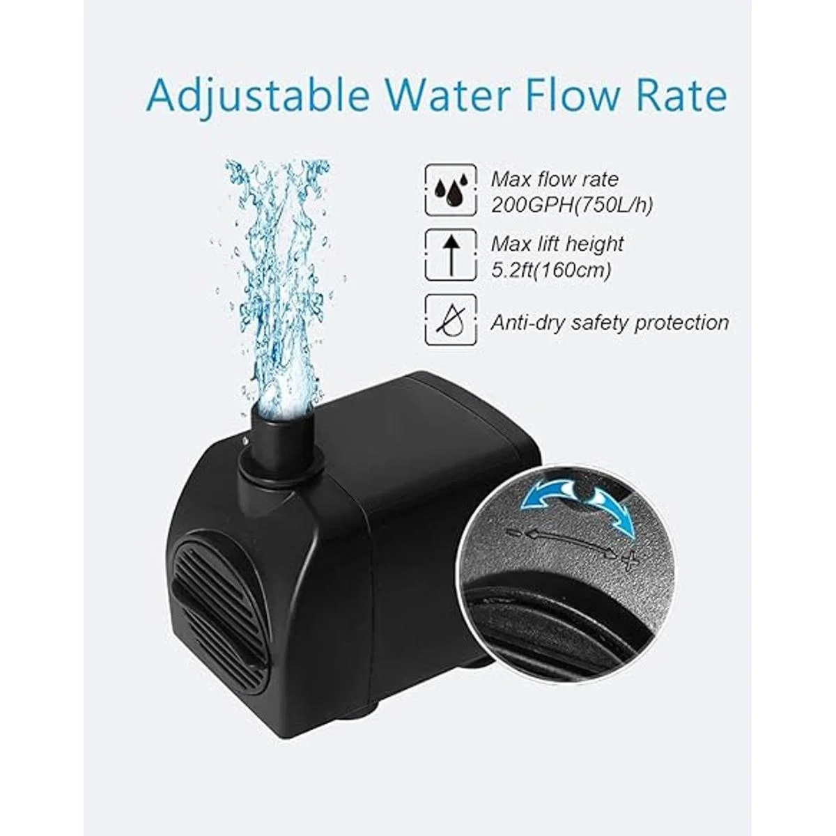 Control de flujo de agua: la perilla ajustable puede contornear el caudal, puedes obtener la cantidad de presión de agua que desees. Flujo máximo 200 GPH, elevación alta de 5.2 pies.