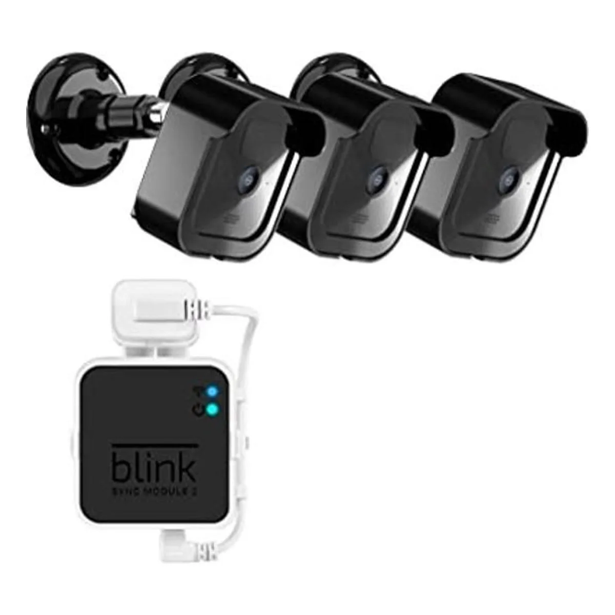 Paquete de fundas para exteriores parpadeantes: 3 paquetes de carcasa resistente a la intemperie, 3 soportes para cámara, soporte de pared para módulo de sincronización Blink, 1 paquete de accesorios de tornillos.