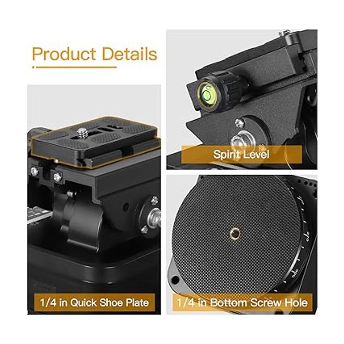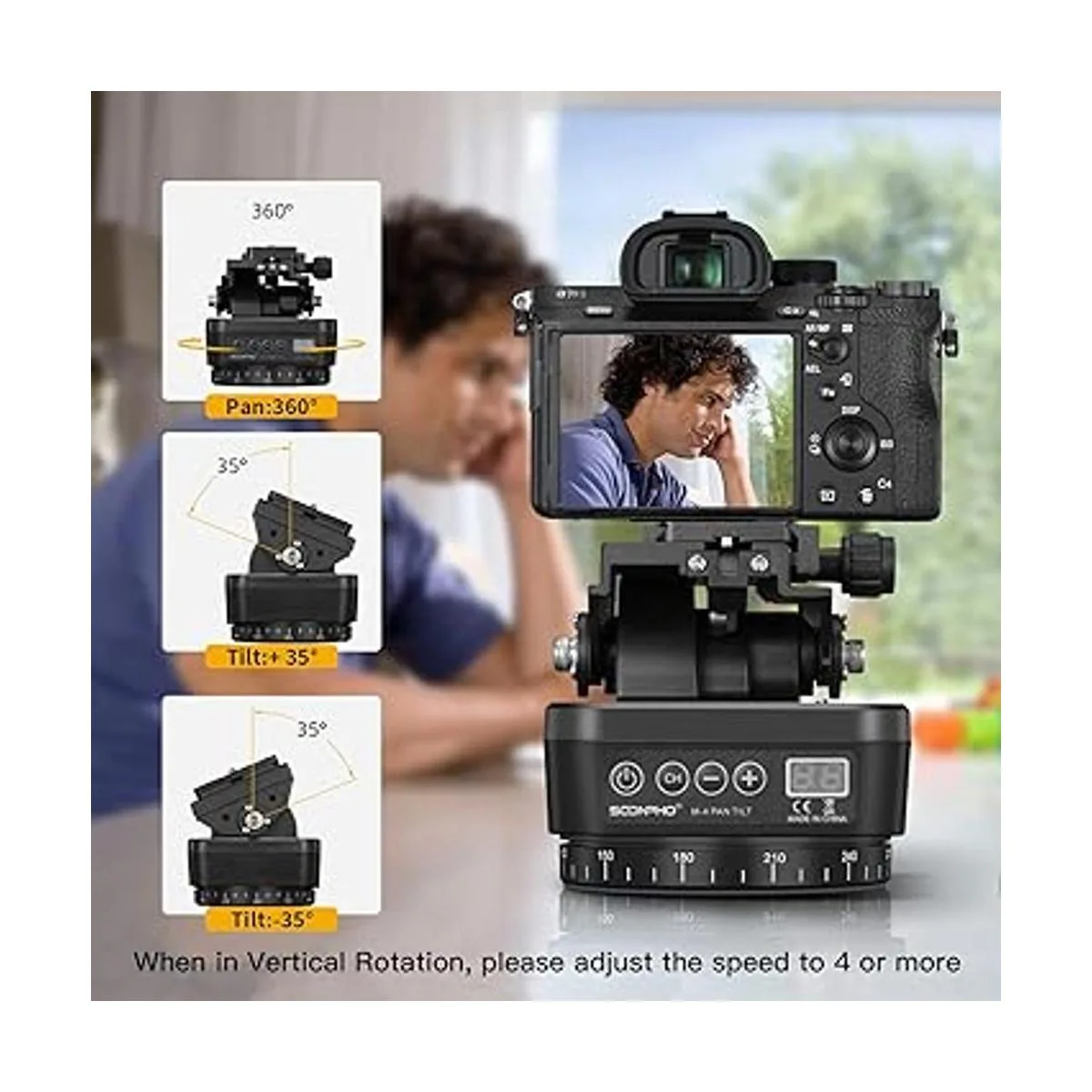 Utiliza el control remoto para ajustar la rotación horizontal de 360 y rotación vertical de 35 de la inclinación panorámica, hay disponibles en 8 velocidades, distancia remota: 65.6 ft. Para disparos profesionales en interiores y exteriores, lo que permite un ajuste rápido de nivel y disparo preciso