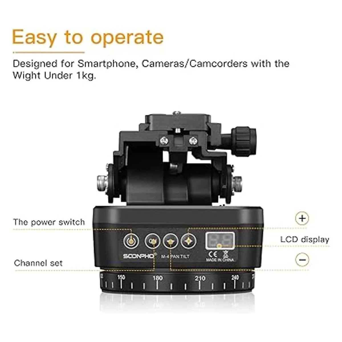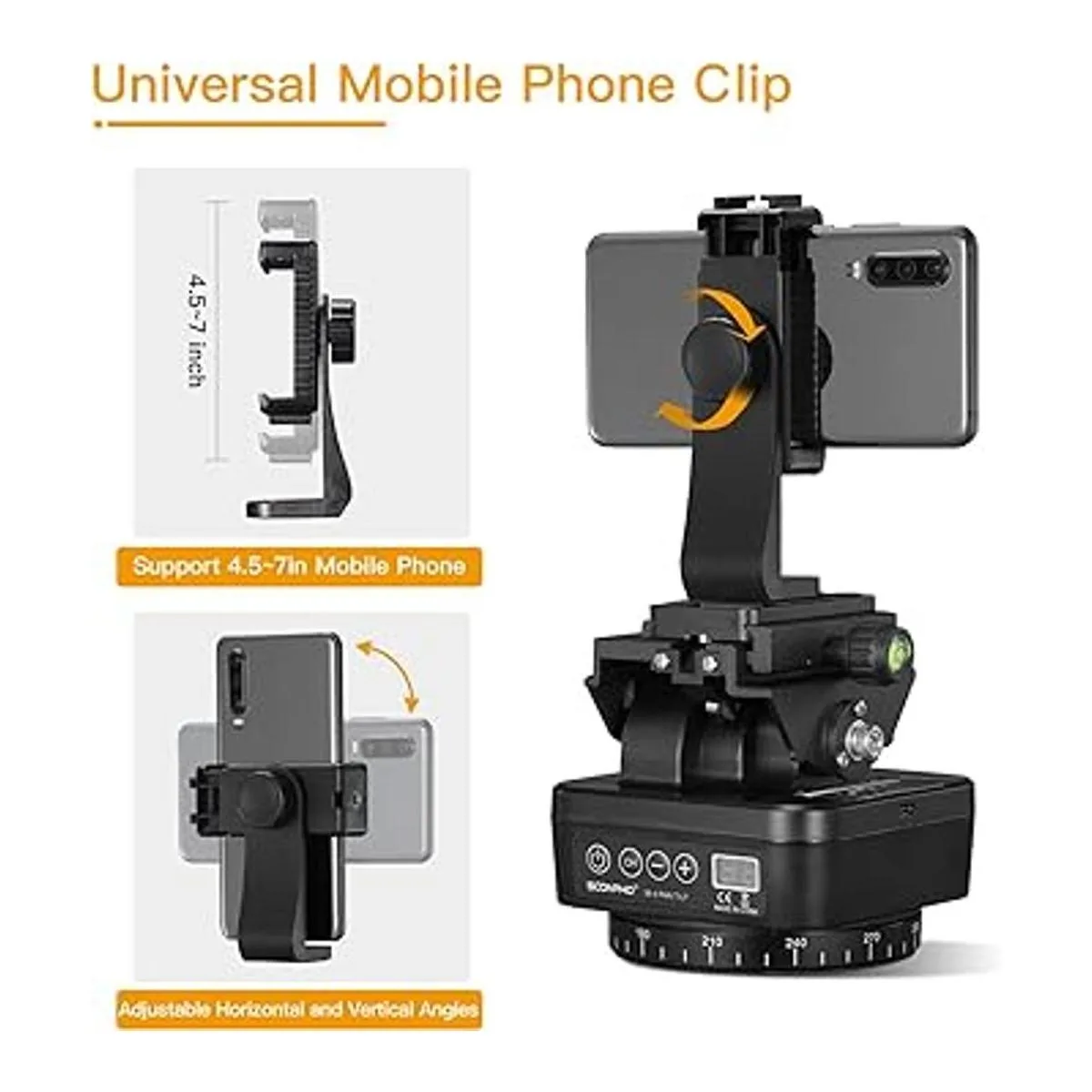 Soonpho M4 Cabezal de trípode panorámico giratorio motorizado, cabeza de inclinación de control remoto con control remoto y clip de teléfono móvil para cámaras DSLR, videocámaras, teléfonos inteligentes, trípode