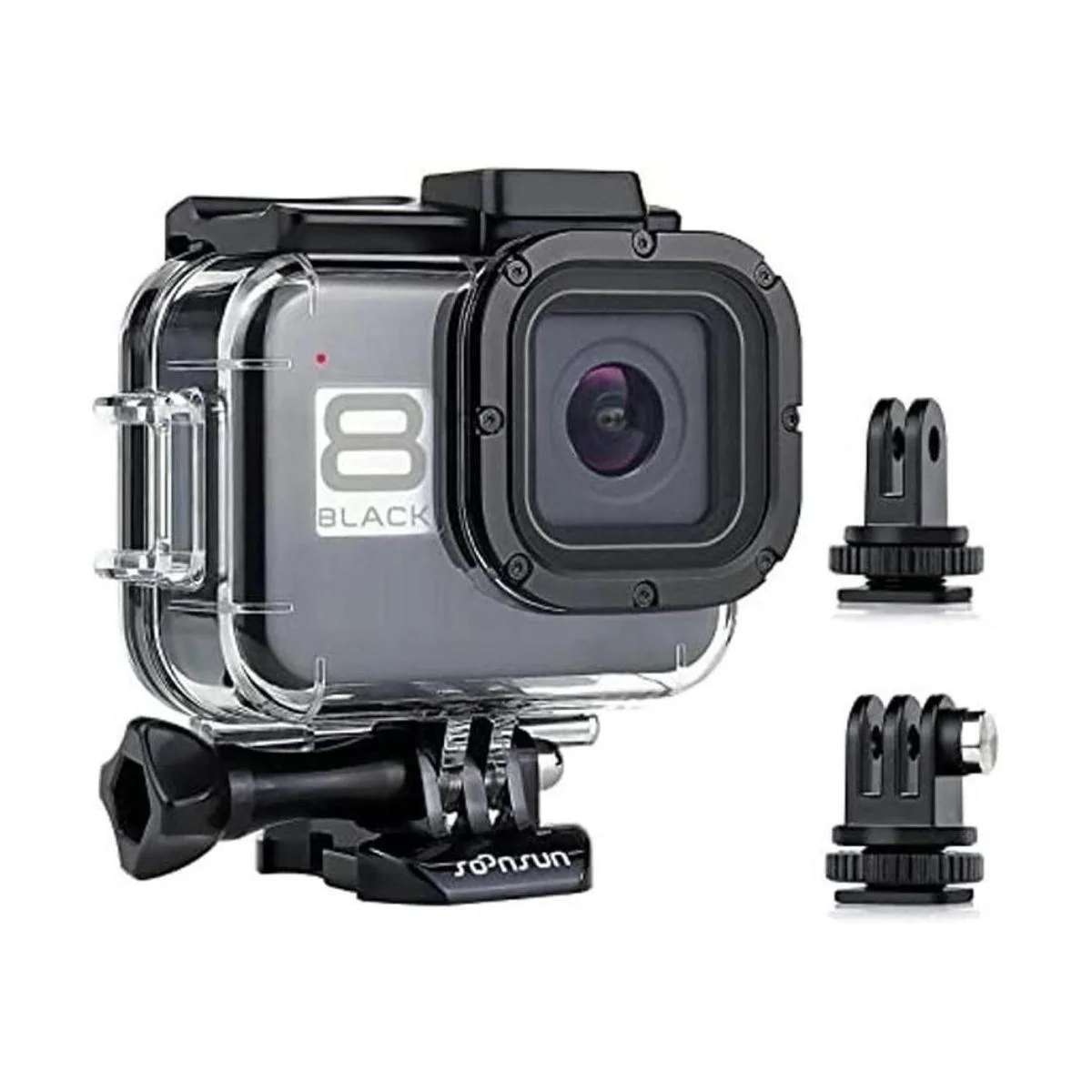SOONSUN Carcasa impermeable para GoPro Hero 8 Negro, doble ranuras para zapata fría incorporadas e incluye 2 adaptadores de montaje para zapatos, funda protectora submarina de 196 pies para GoPro Hero8, color negro