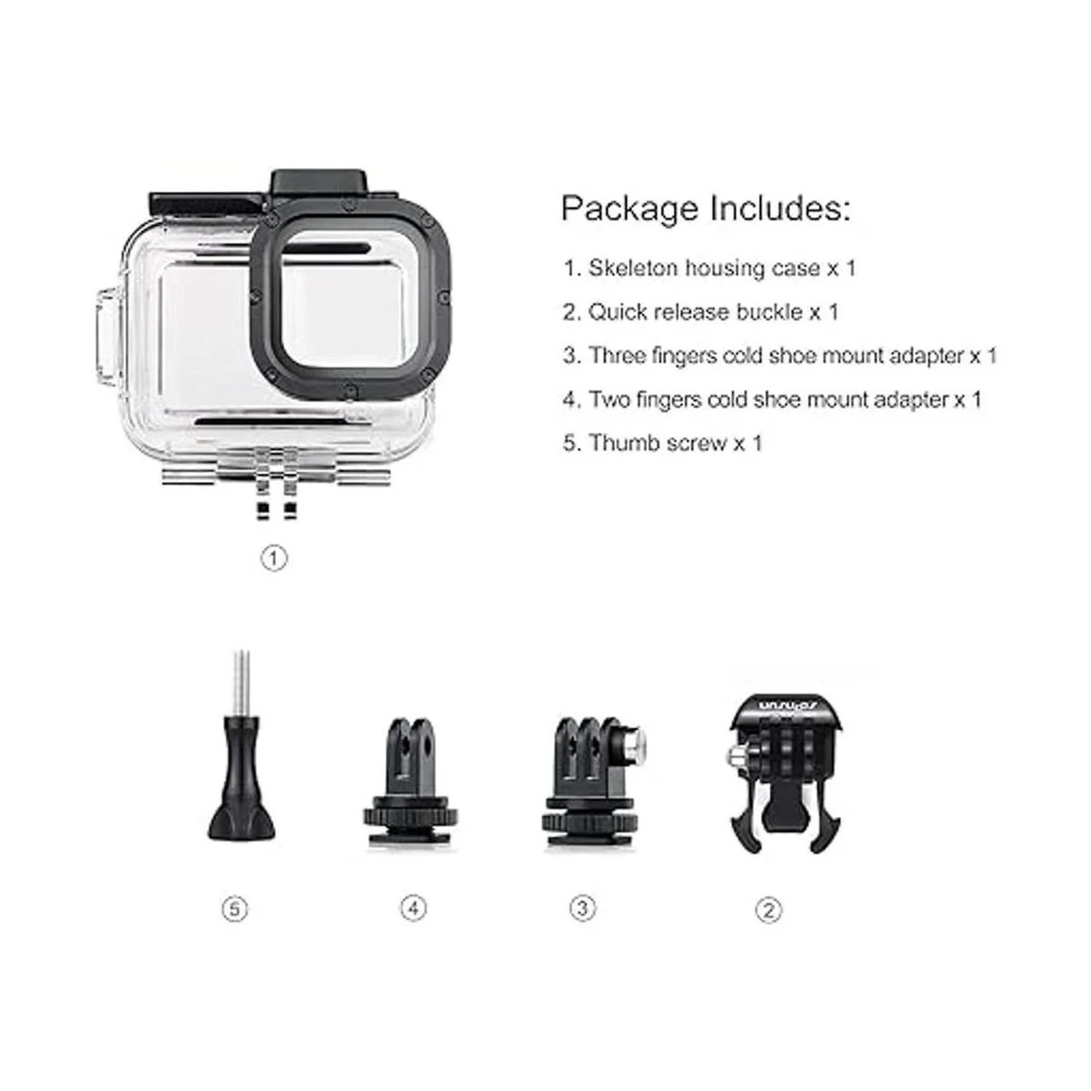 El paquete incluye: 1 funda protectora de esqueleto, 1 hebilla de liberación rápida, 2 adaptadores de montaje de zapata fría, 1 tornillo de pulgar.