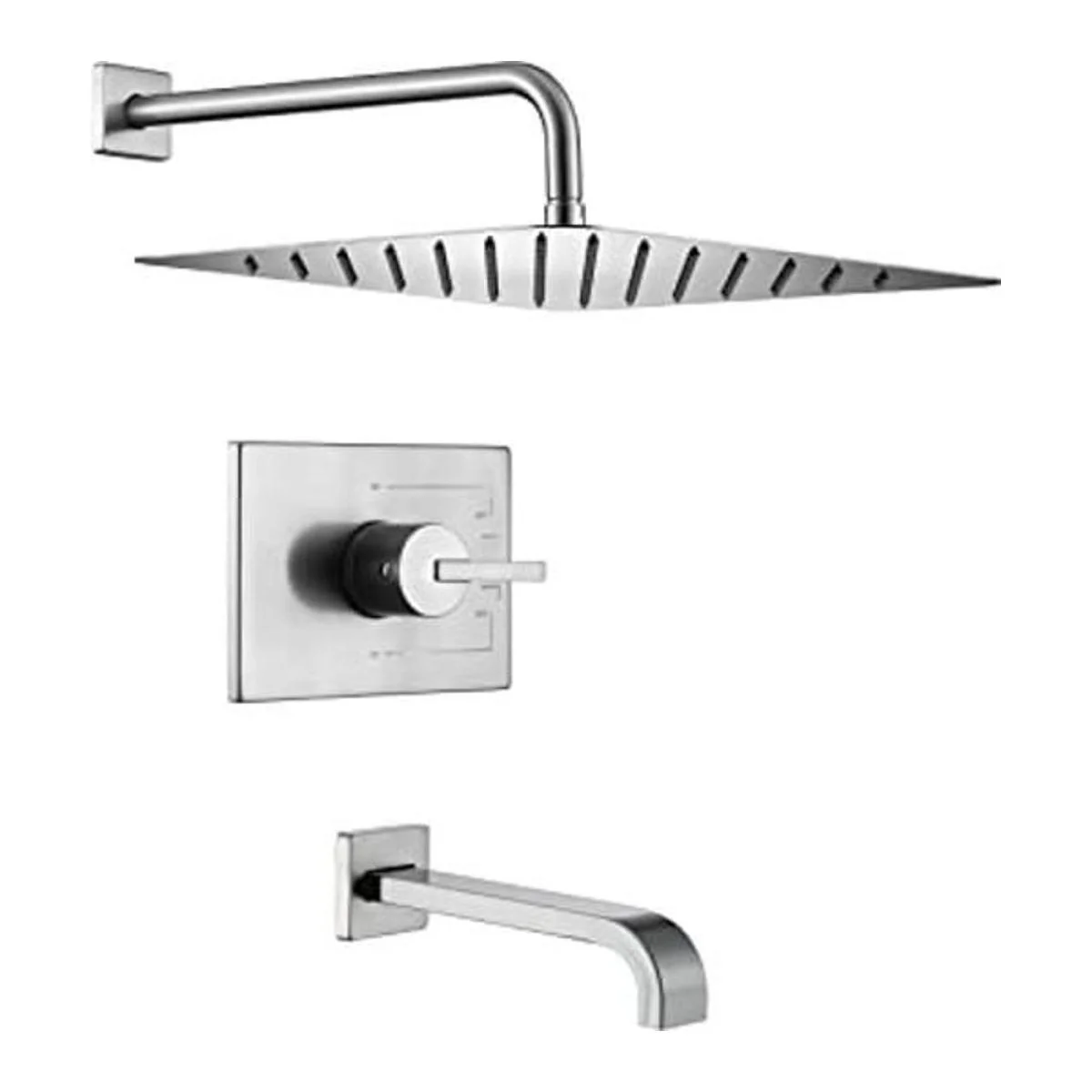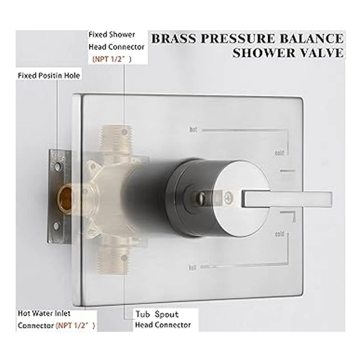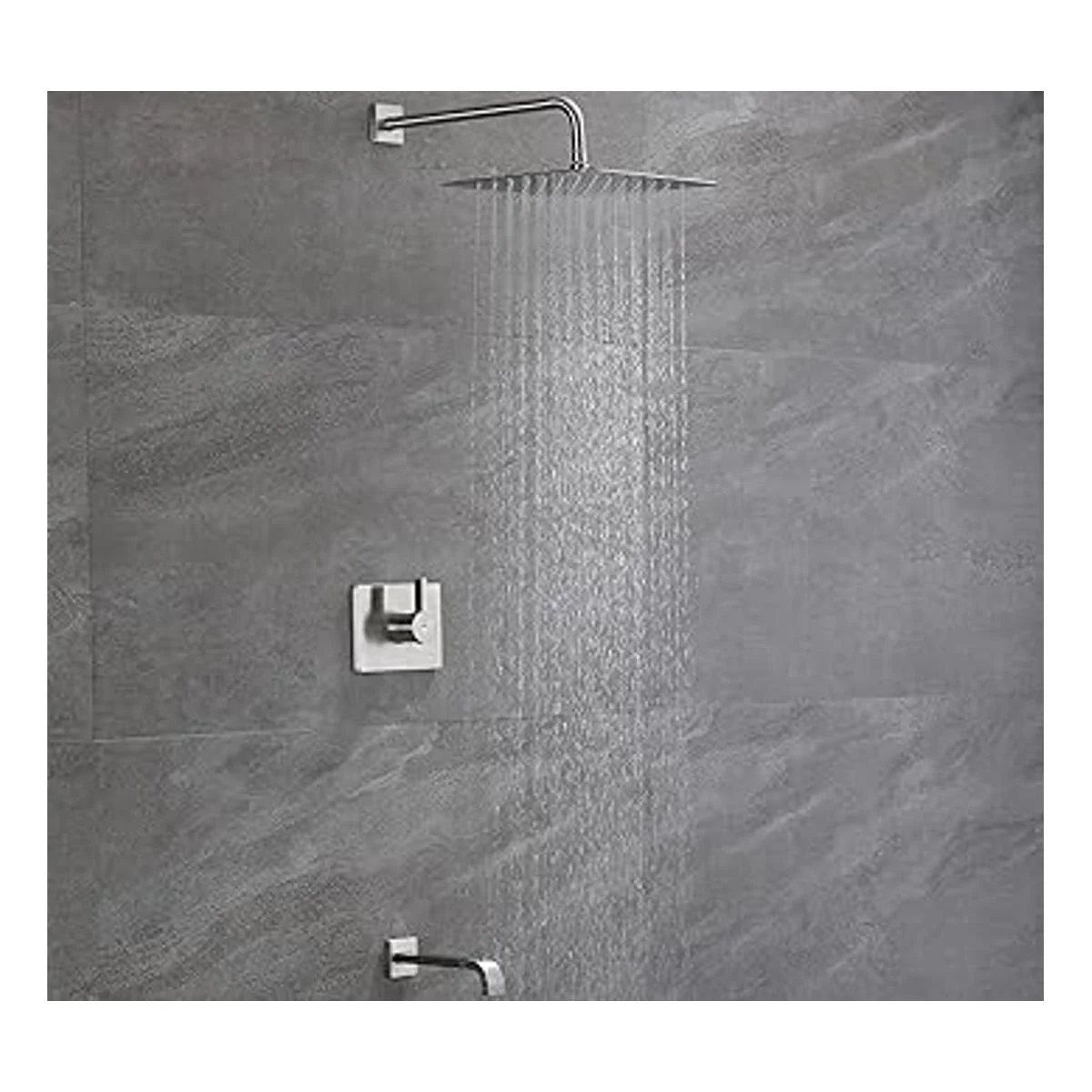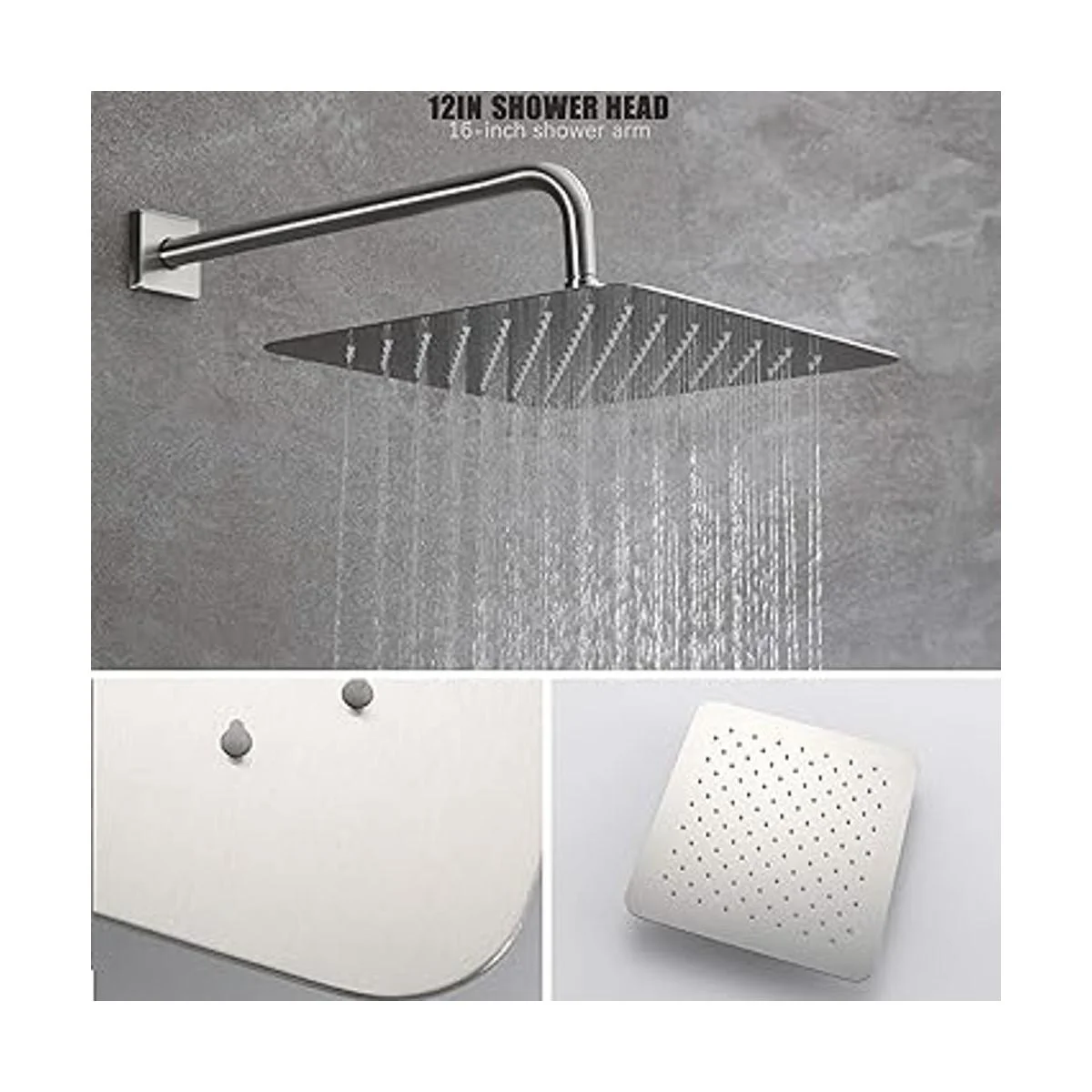 Kit completo : Incluye cabezal de ducha cuadrado de 12 pulgadas acero inoxidable 304, brazo de ducha de 16 pulgadas acero inoxidable 304, válvula de control mezclador de ducha latón, boquilla de bañera acero inoxidable 304, brazo de ducha, boquilla de bañera y válvula mezcladora de ducha son de rosca NPT de 0.5 in. Tamaño de conexión estándar de Estados Unidos, asegurando una instalación fácil y rápida.