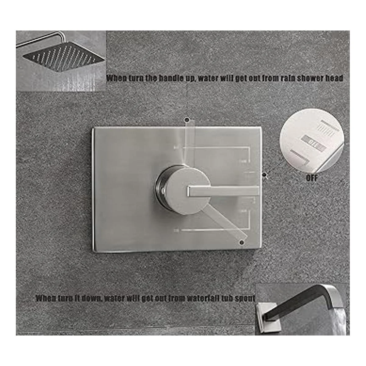 SOOOHOT Sistema de ducha de lluvia con boquilla de cascada de 2 funciones de níquel cepillado que contiene cabezal de ducha de 12 pulgadas y kit de moldura de boquilla de bañera válvula incluida