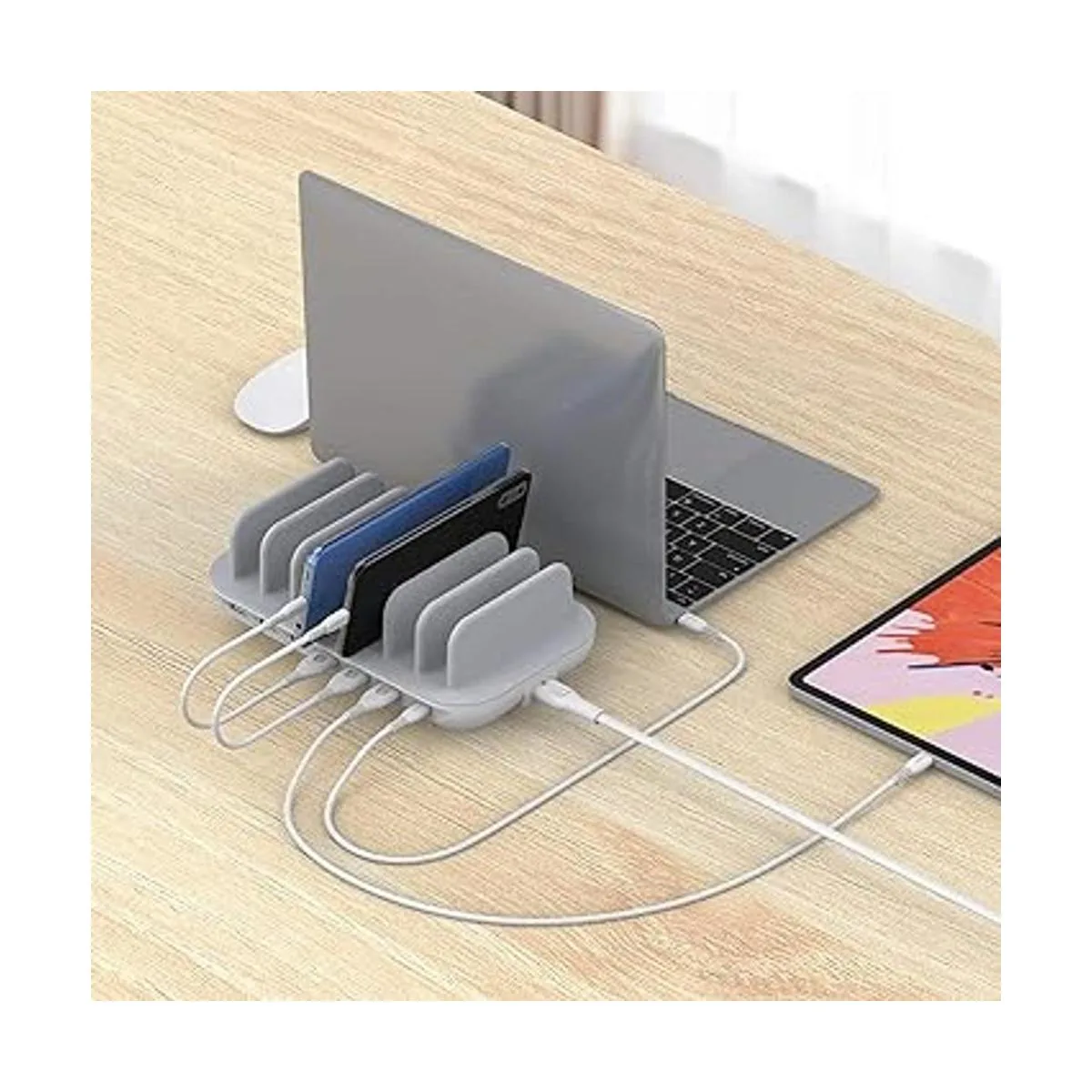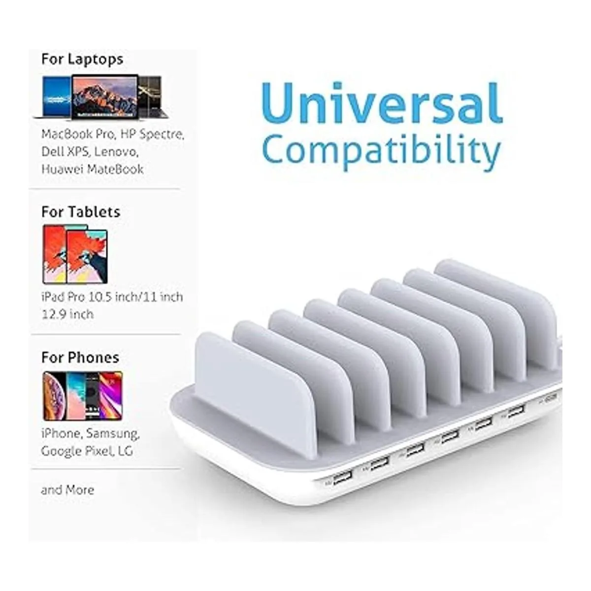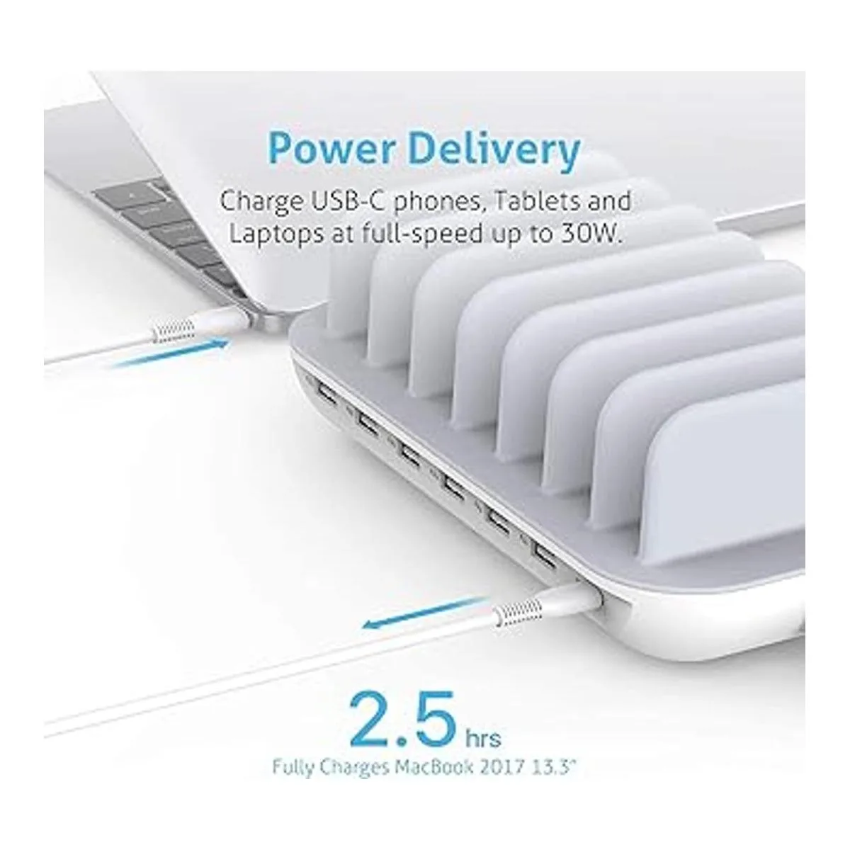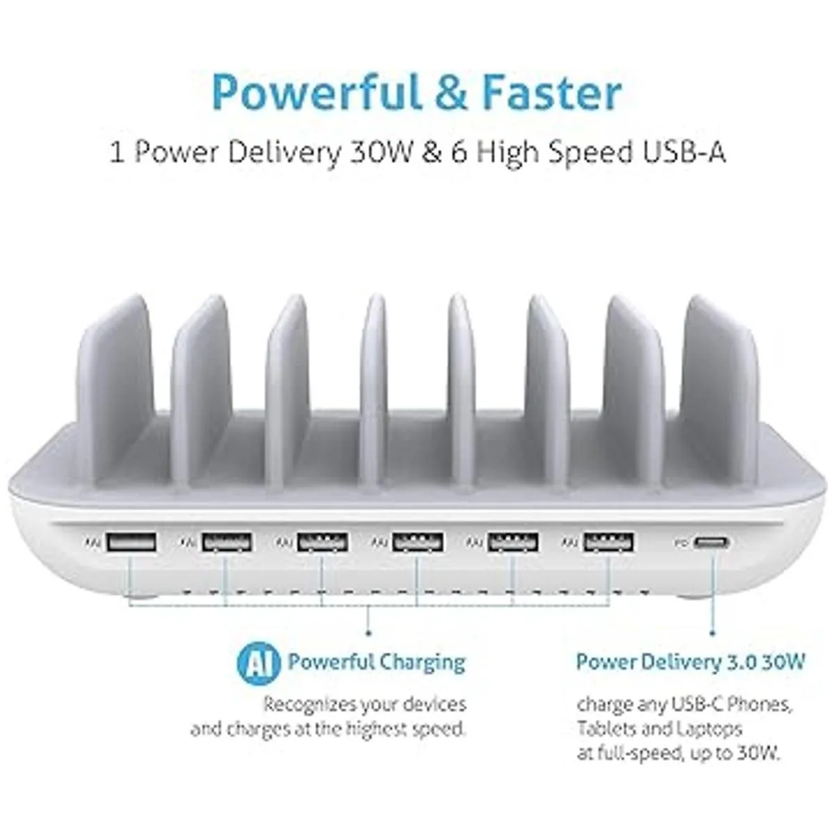 Estación de carga todo en uno con 1PD y 6 AI: con un puerto de entrega de energía dedicado y 6 puertos USB de alimentación de alta velocidad, optimizado para un rendimiento impecable con teléfonos USBA y USBC, tabletas, portátiles y mucho más.