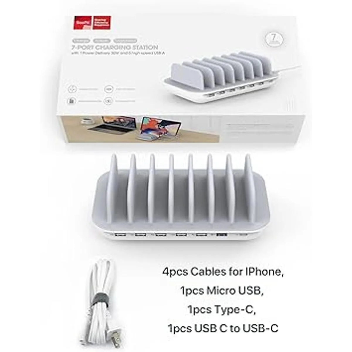 Cuidadoso para ti todo, lo que obtienes en la caja: 1 estación de carga SooPii Premium de 7 puertos, paquete de 7 cables de carga para tu uso diario, instrucciones rápidas, tarjeta de servicio, nuestro servicio al cliente amigable de 24 meses sin preocupaciones.
