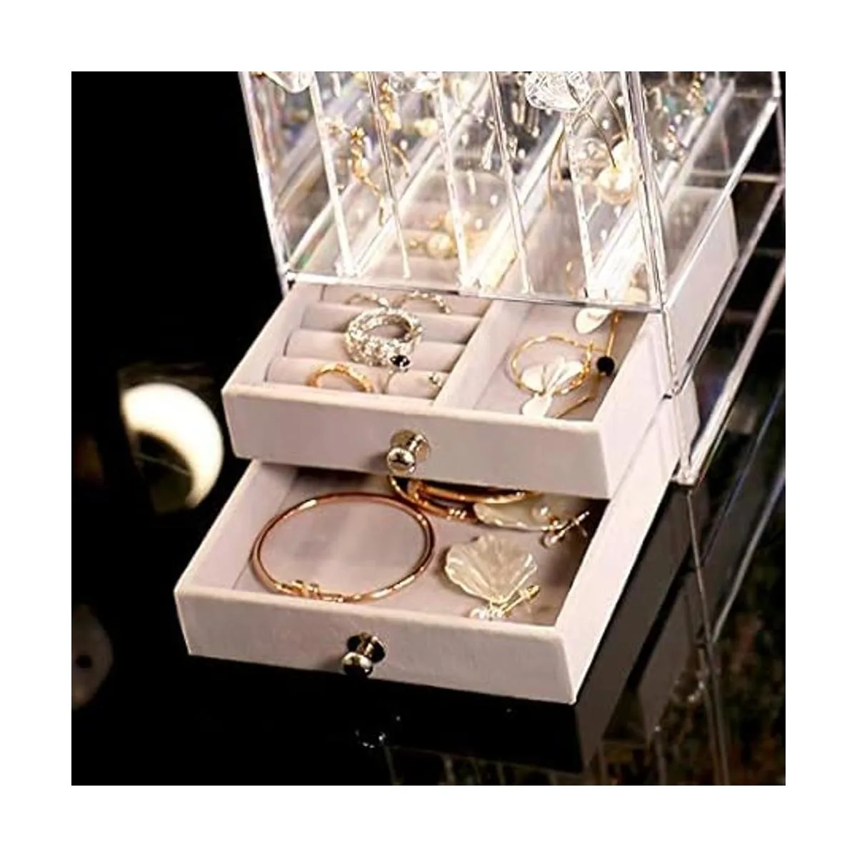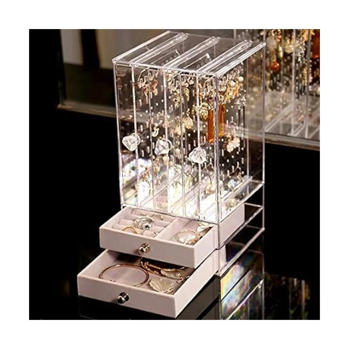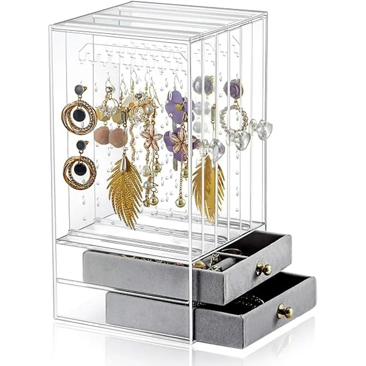 Almacenamiento de lago: 5 cajones contienen 3 paneles acrílicos deslizantes verticales que se pueden sacar fácilmente, 2 cajones de terciopelo gris suave. Los 3 cajones verticales tienen 192 agujeros para aretes y 27 ranuras para collares. Los anillos, collares, pulseras, gemelos, cadenas, broches y otras joyas se pueden colocar en los 2 cajones inferiores.