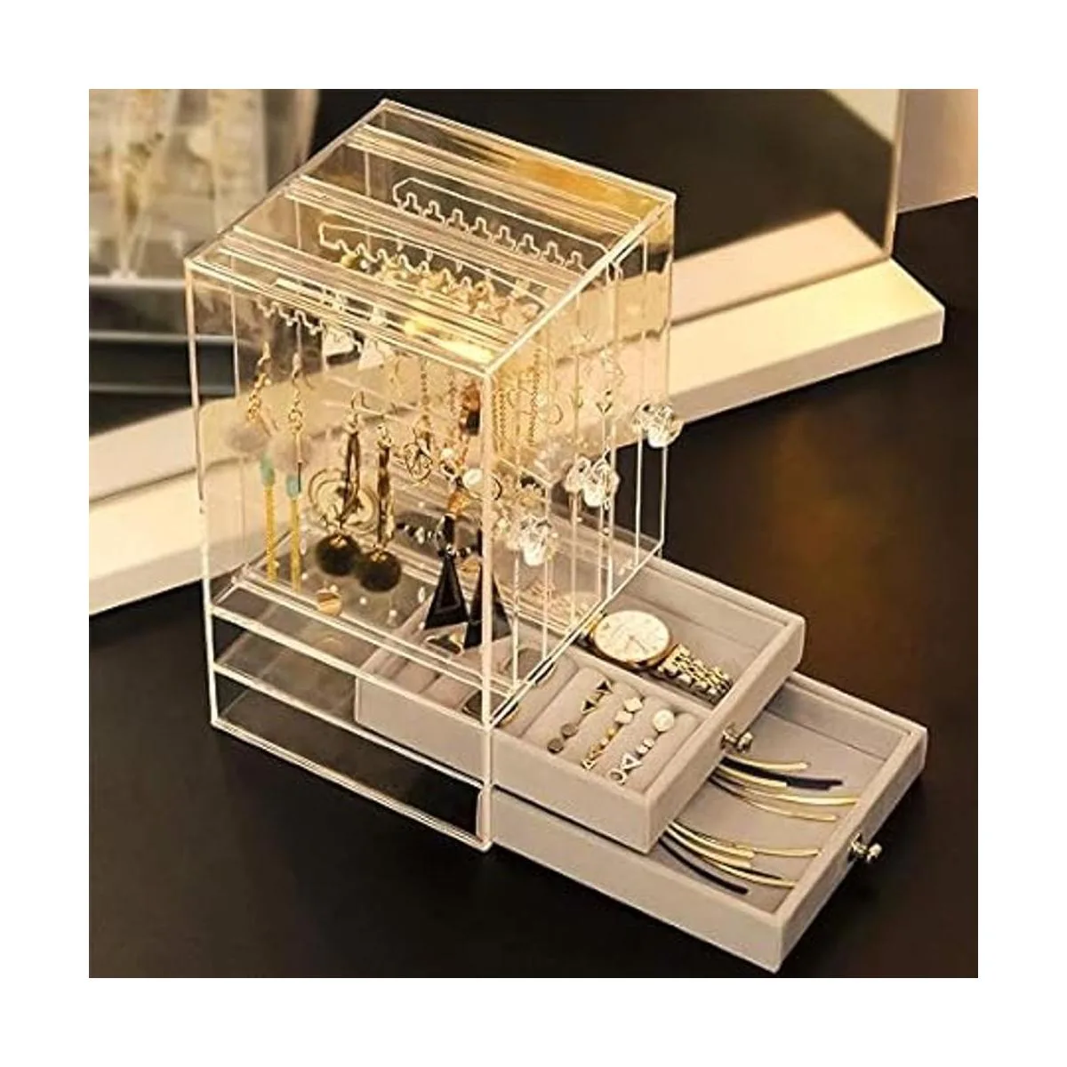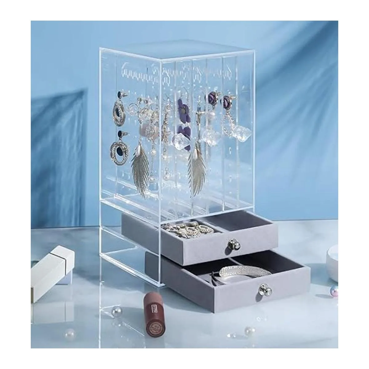 Sooyee Soporte de acrílico para aretes y organizador de joyas con 5 cajones, soporte de joyería a prueba de polvo clásico para collares, pulseras, aretes y anillos, transparente
