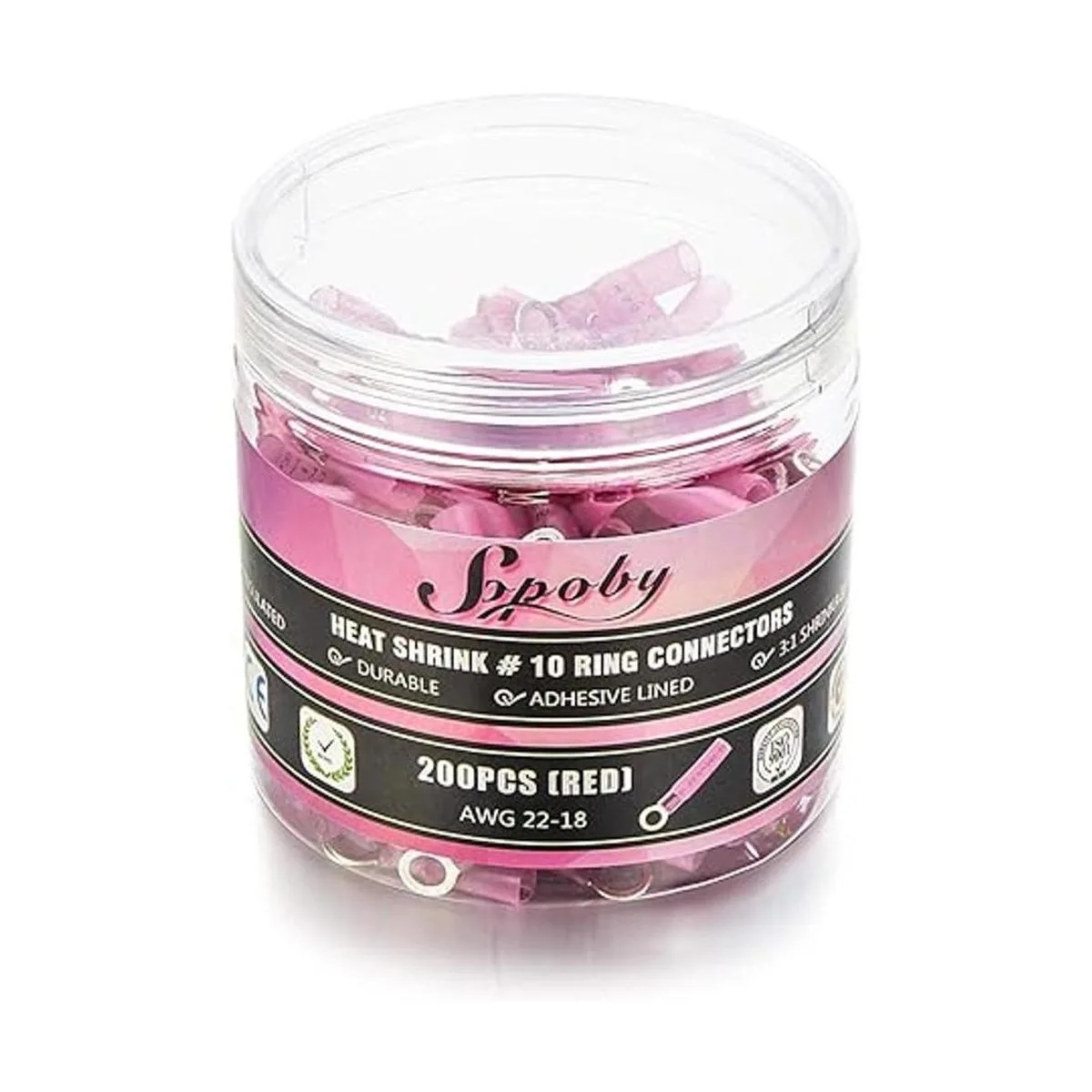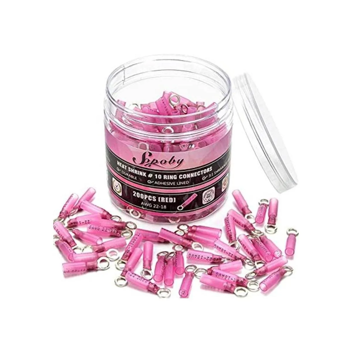 Sopoby 200 conectores de anillo termorretráctil, color rojo, 2218 AWG, kit de conectores de cable termorretráctil, conectores eléctricos de crimpado, terminales de anillo marino automotriz