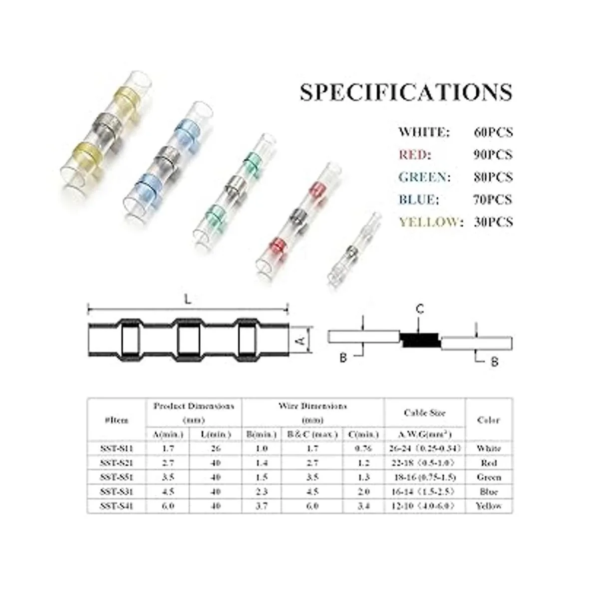 Sopoby 330 piezas kit de conector de alambre de sellado de soldadura, conectores de soldadura a tope eléctricos aislados a prueba de agua empalme de alambre para juntas de cables para barcos automotrices y camiones 5 colores5 tamaños