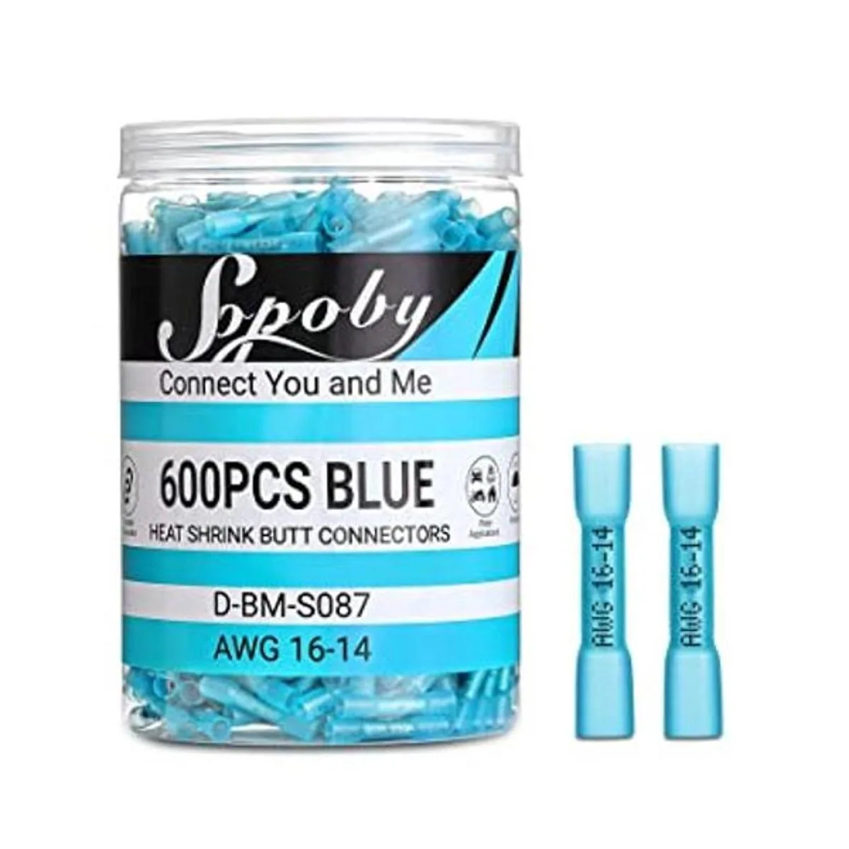Sopoby 600 conectores de tope termocontraíbles color azul, 1614 AWG, cobre rojo estañado, conectores de tope de grado marino, conectores de empalme de cables, conectores eléctricos impermeables para marina, barco, estéreo