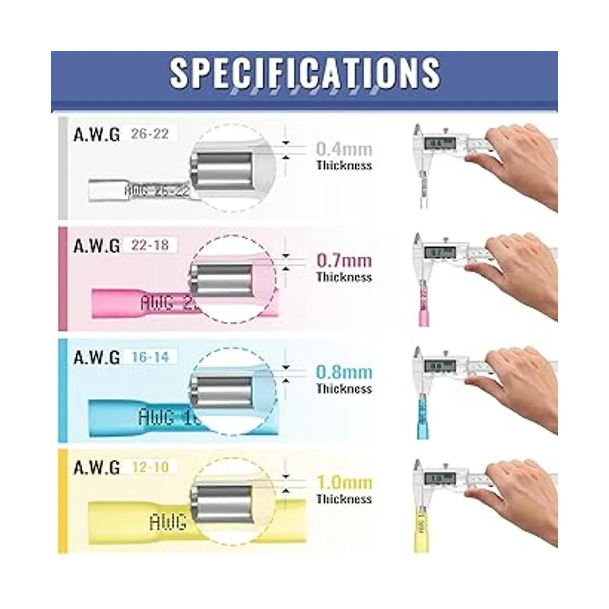 Núcleo de cobre de alta calidad y tubo termorretráctil: hecho de cobre estañado de alta calidad y tubo termorretráctil forrado con adhesivo. Estos conectores profesionales garantizan la protección contra los elementos. El tubo termorretráctil proporciona una alta resistencia a la tracción y resistencia al estiramiento y daños mecánicos, núcleo de cobre de alto grosor que garantiza la protección contra los elementos.
