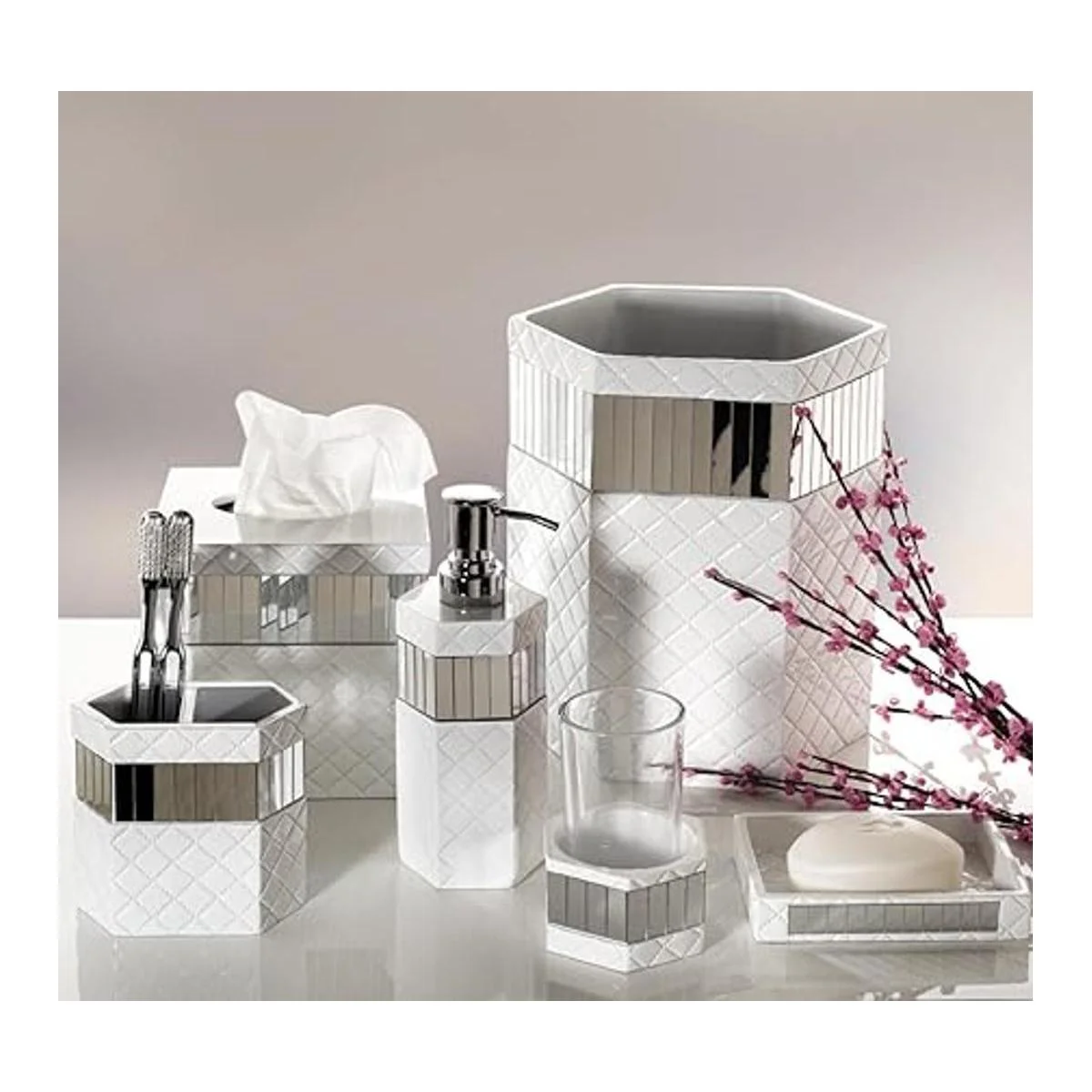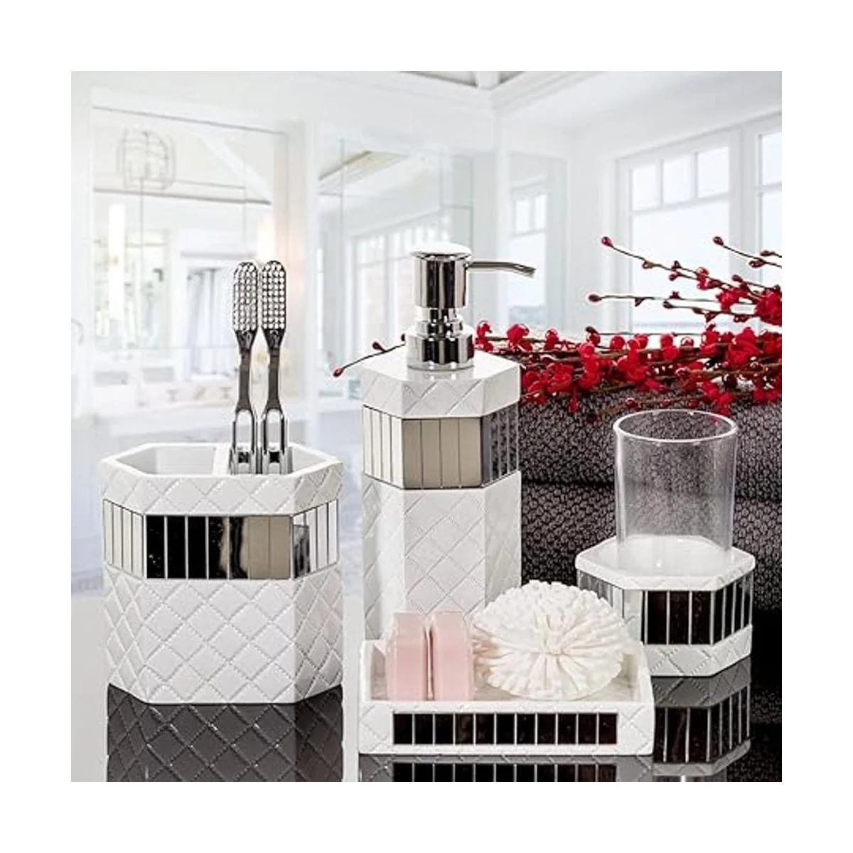 Soporte decorativo para cepillo de dientes familiar: le da a tu baño un toque elegante con los detalles verticales de espejo plateado en la parte superior y un patrón acolchado blanco alrededor.