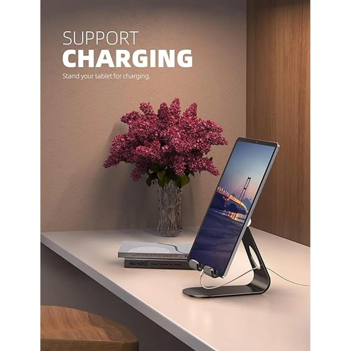 Soporte multiángulo se ajusta fácilmente, apoyando tanto vertical como horizontal de visualización.