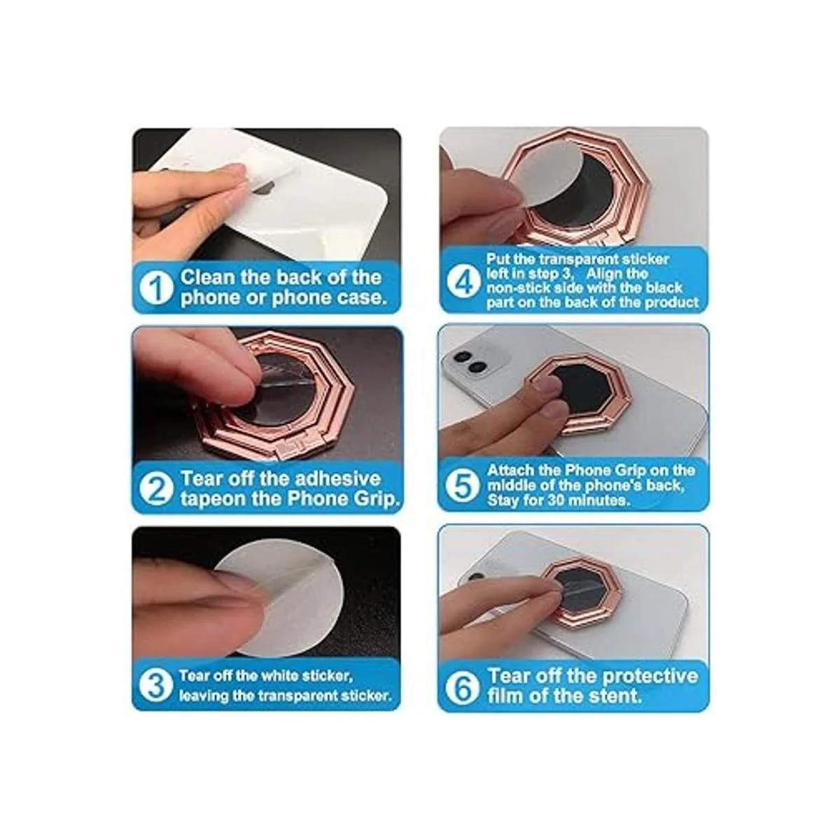 Material de calidad: el soporte para teléfono está hecho de aleación de zinc de alta calidad, que es duradero y no se decolora, incluso durante mucho tiempo. Con cinta adhesiva 3M que se fija bien a smartphones, fundas de teléfono, tabletas, libros electrónicos e interruptores, etc. No se pega a tela, vidrio, silicona líquida o superficies texturizadas no planas. Nota: Espera 1 hora para usar después de la instalación.