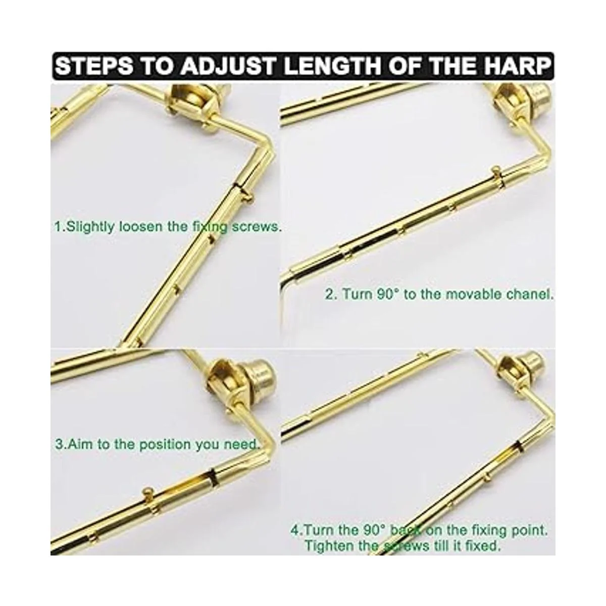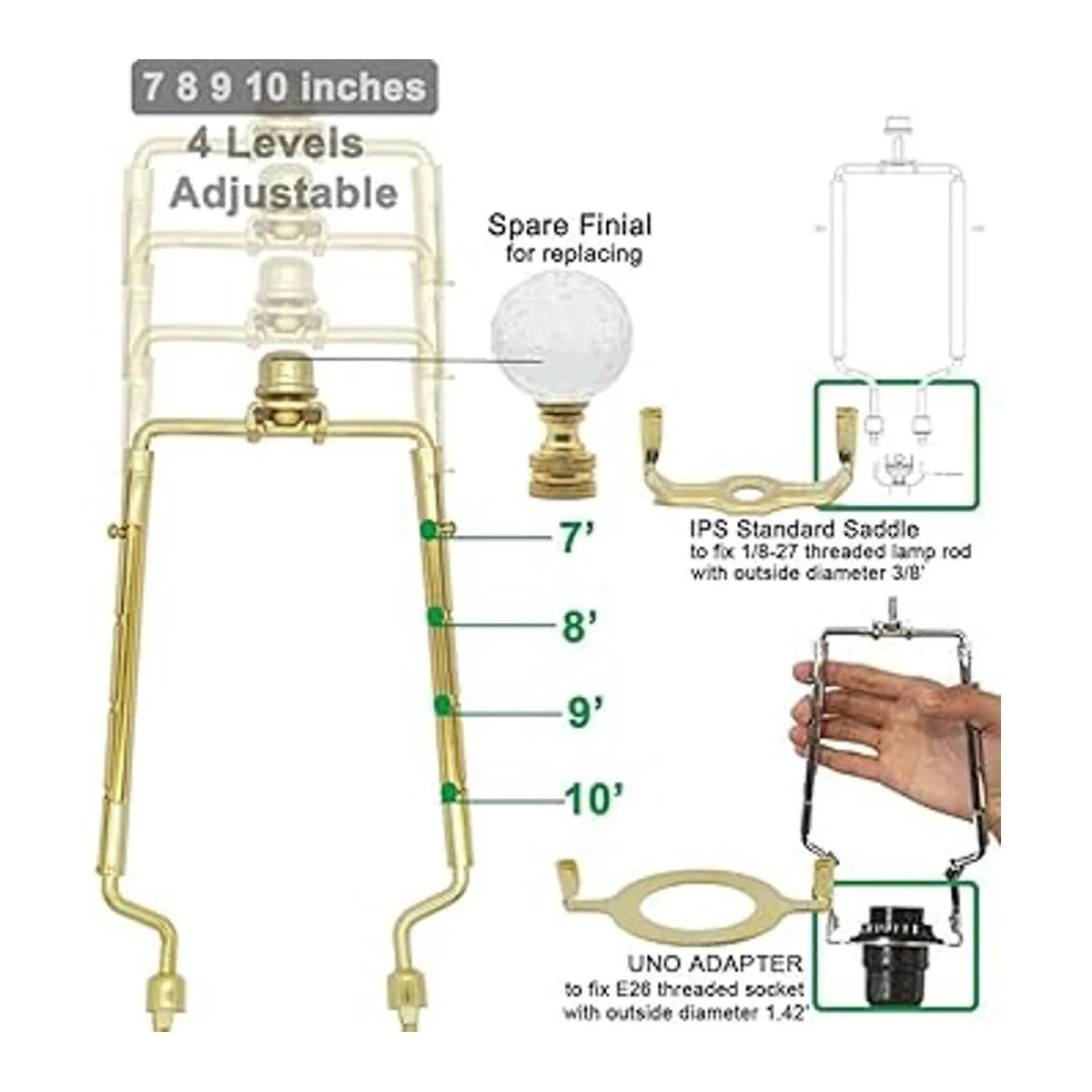 Soporte de arpa de 7, 8, 9, 10 pulgadas, arpa de lámpara dorada ajustable se adapta tanto a base de luz E26 como a base de silla, juego de remates de adaptador UNO Fit de color latón