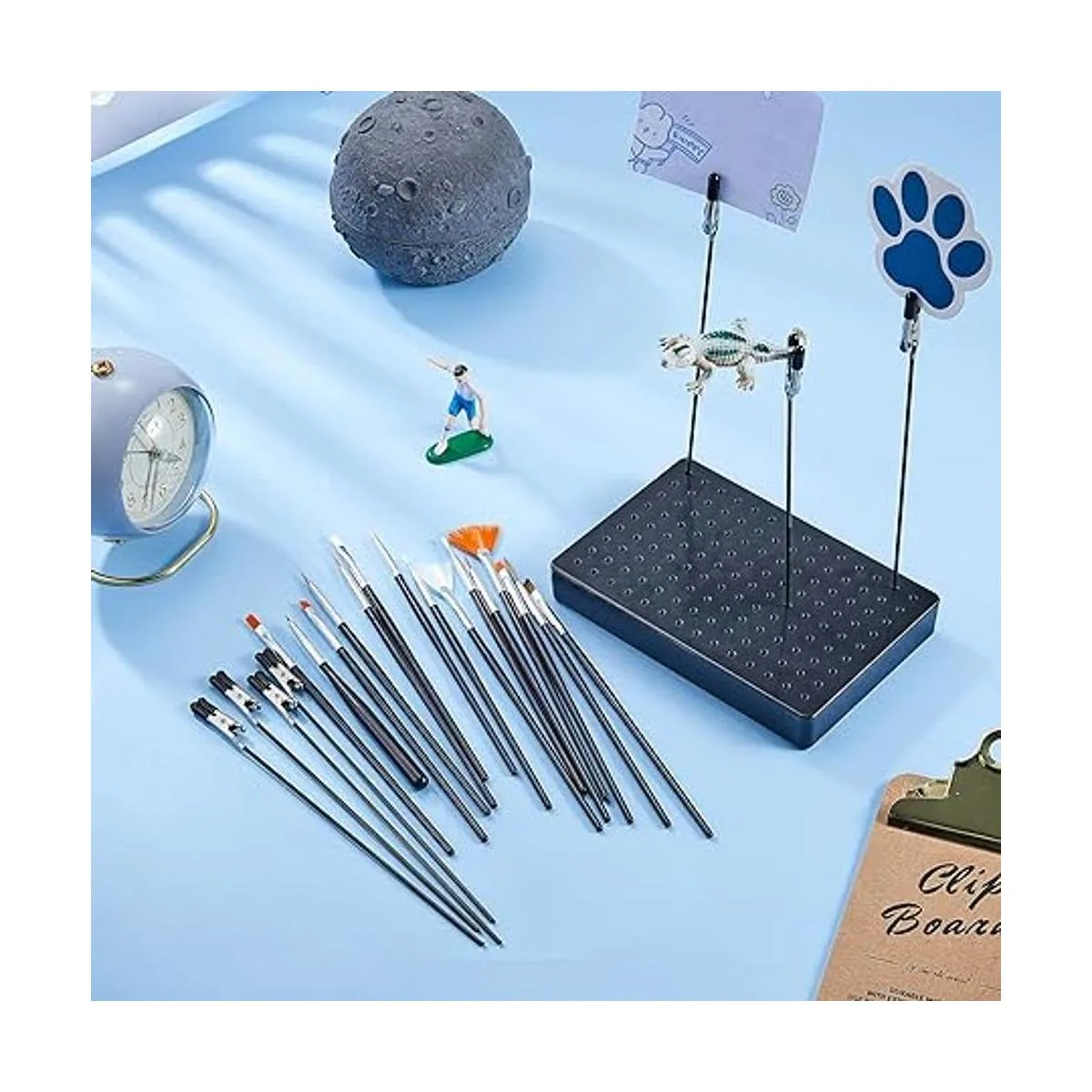 Material fiable y de calidad: nuestra base de soporte de pintura está hecha principalmente de palstica, que es resistente y sólido, no se decolora ni rompe fácilmente; los clips de cocodrilo para manualidades están hechos principalmente de goma, material de metal, que son ligeros y reutilizables; el cepillo limpio está hecho principalmente de plástico, aluminio, material de lana de nailon, material fiable que se puede aplicar durante mucho tiempo