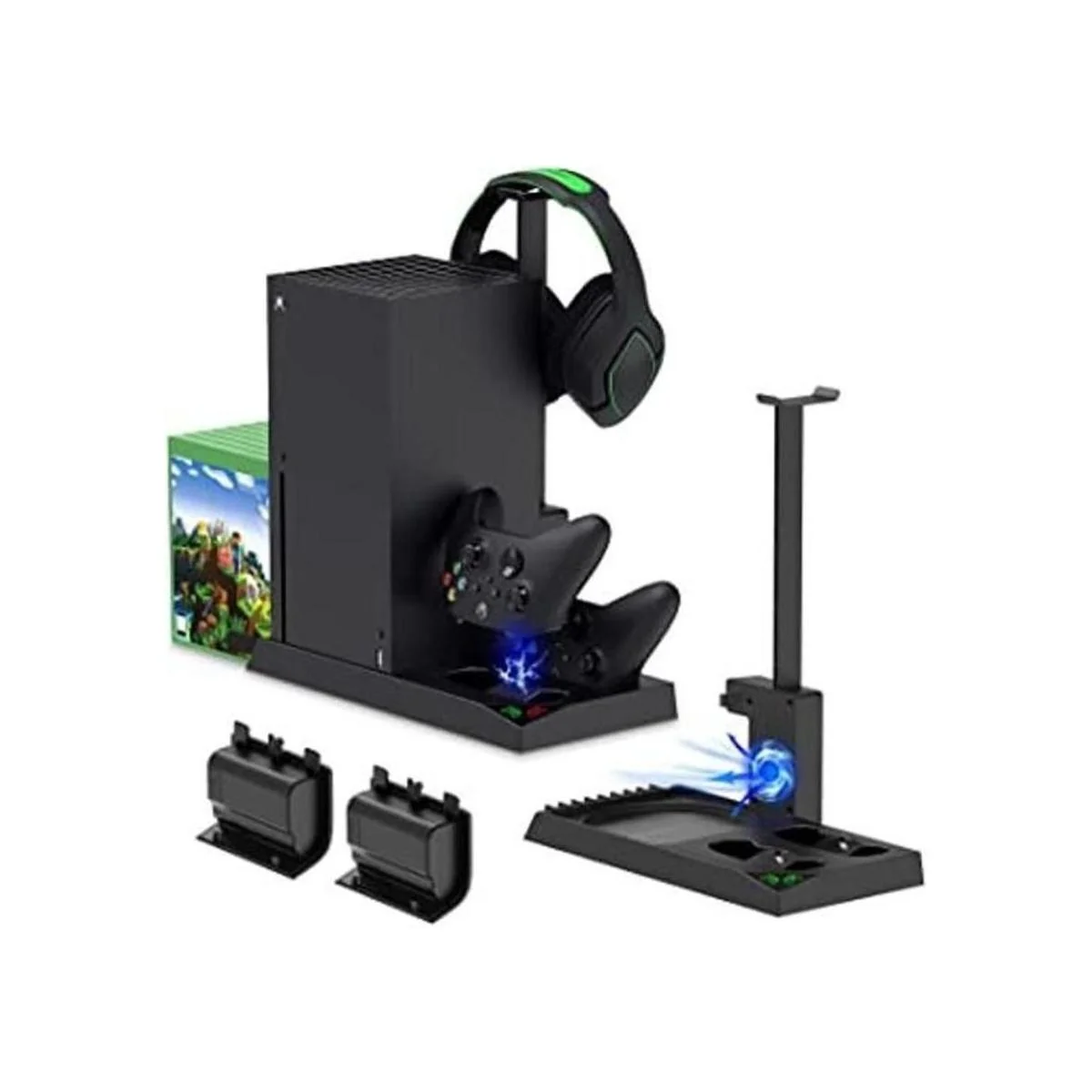 Diseño 5 en 1: soporte vertical para consola Xbox Series X, 1 ventilador integrado para consola Xbox Series X, cargador dual 2 controladores para Xbox Series X, soporte para auriculares, almacenamiento de 10 discos de juego. Equipado con dos baterías de 1400 mAh. Nota: el puerto USB extendido no es compatible con transmisión de datos. El cargador dejará de funcionar cuando la consola se apaga, pero el modo de suspensión se puede cargar. El soporte no funciona para el controlador Xbox One