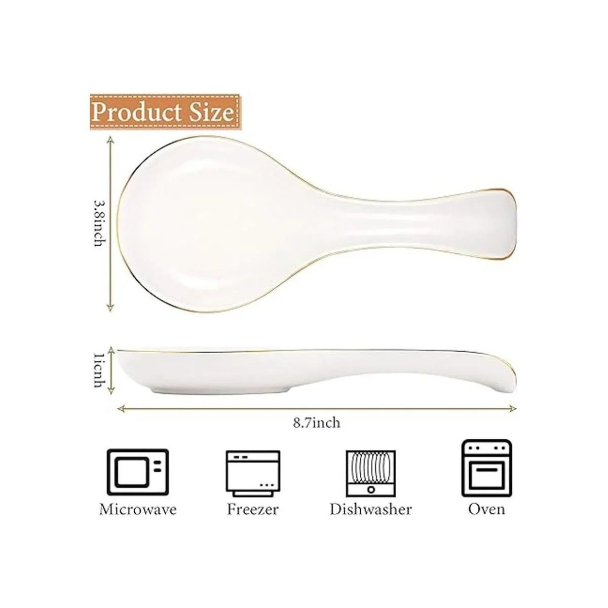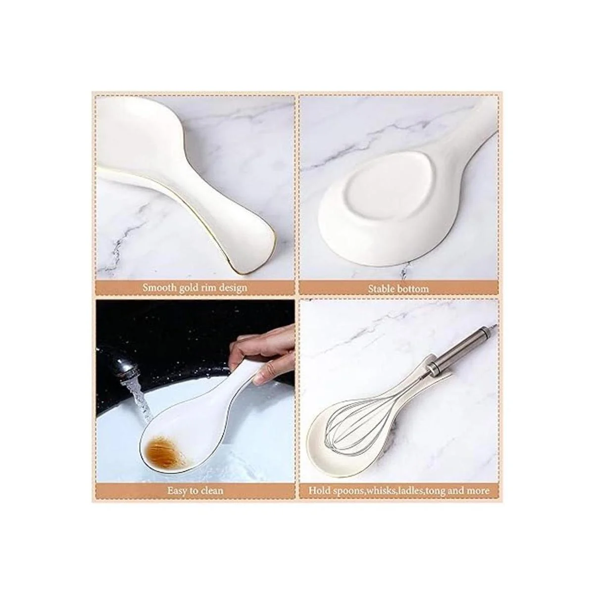 El paquete incluye: el paquete viene con 1 pieza de soporte de cuchara de cerámica con borde dorado que es agradable para descansar cucharas grandes y pequeñas, cucharas de agitar, cucharilla, cubiertos, cucharones de sopa, espátulas y otros utensilios de cocina para mantener tus mostradores limpios y libres