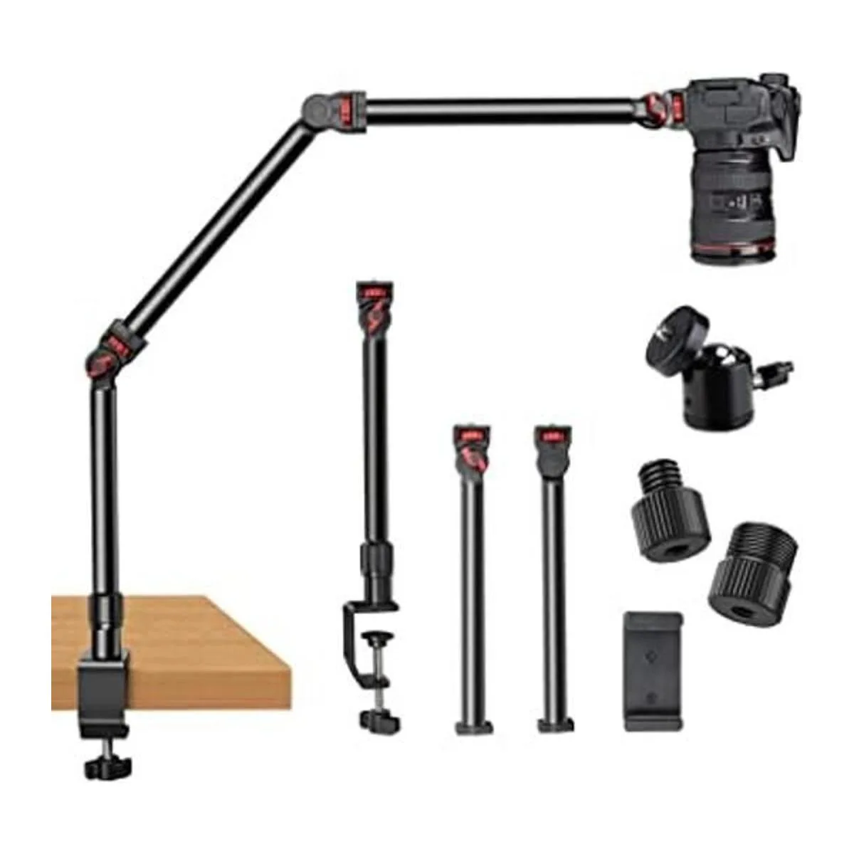 Diseño flexible y ampliamente utilizado: cada poste tiene un punto de ajuste de ángulo, y hay agujeros de tornillo de 1/4 pulgadas en la parte inferior del brazo de la cámara, puedes conectar soportes de cámara de escritorio y trípodes en cualquier interfaz. Puedes conectar dispositivos de cámara DSLR/cámara web/proyector/teléfono/luz de vídeo/micrófono, etc. para grabación de video, YouTube, transmisión en vivo, lección en línea, horneado, vlogging.