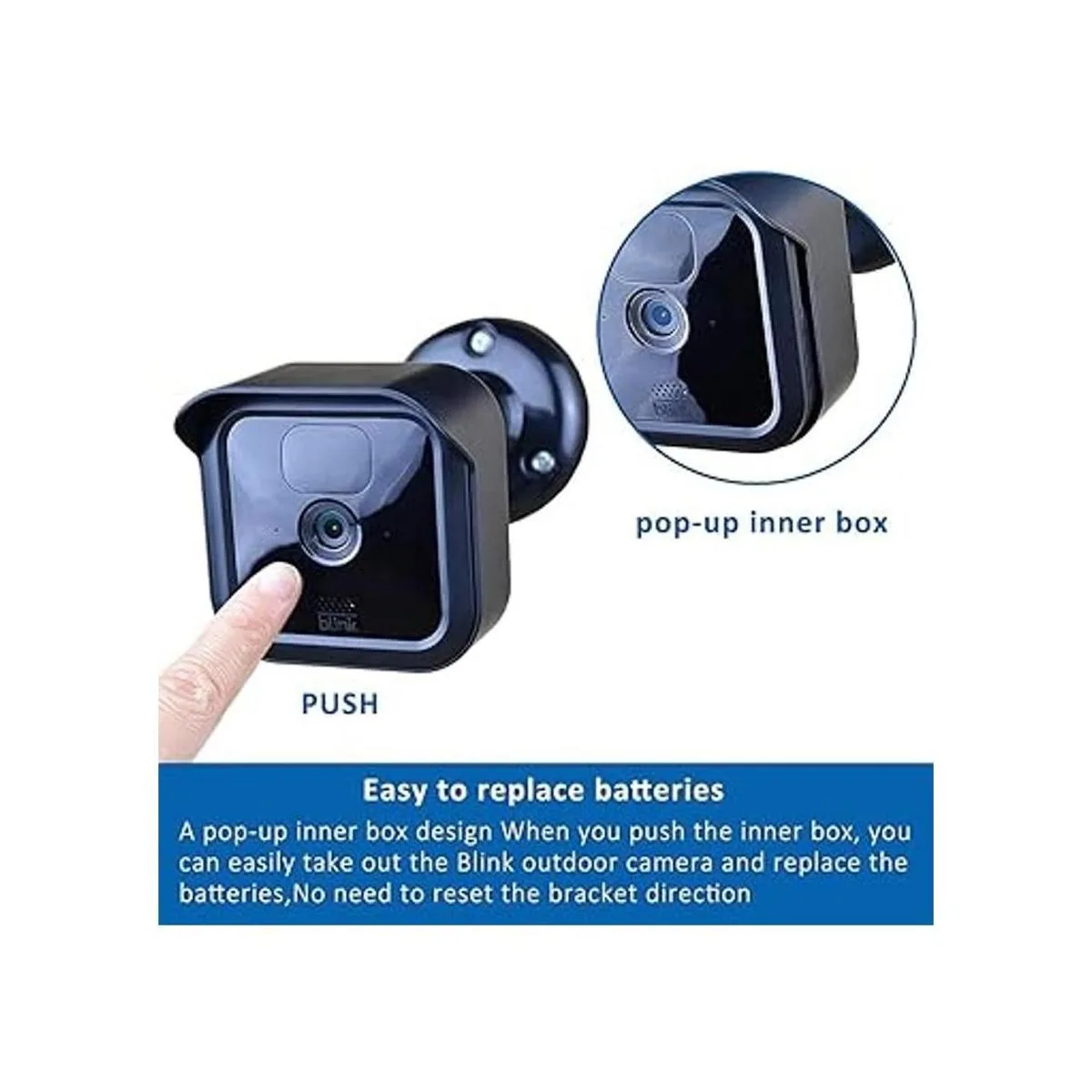 Diseño único: un diseño de caja interior emergente. Cuando empujas la caja interior, puedes sacar fácilmente la nueva cámara Blink Outdoor y reemplazar las baterías, no hay necesidad de restablecer la dirección del soporte, la apertura única está diseñada en la parte posterior para una fácil gestión de cables