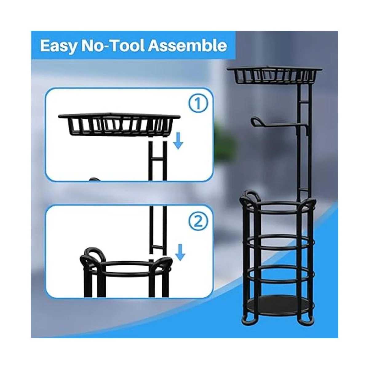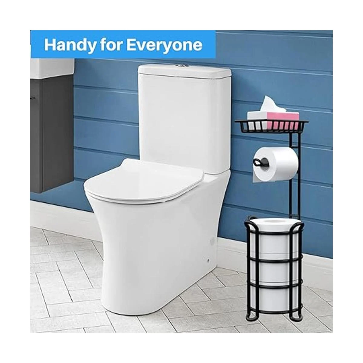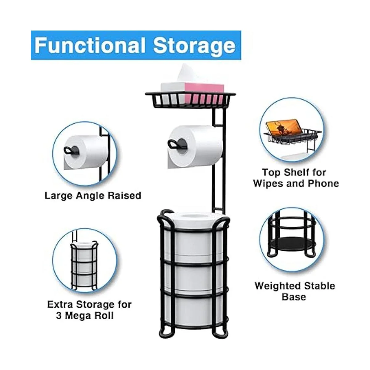 Diseño práctico: el soporte para rollos de papel higiénico 3 en 1 viene con una barra horizontal, una amplia base de almacenamiento y un estante superior que te permite almacenar objetos pequeños como teléfonos celulares, pañuelos, toallitas desechables, así como ambientador, desinfectante de manos u otros artículos de tocador.