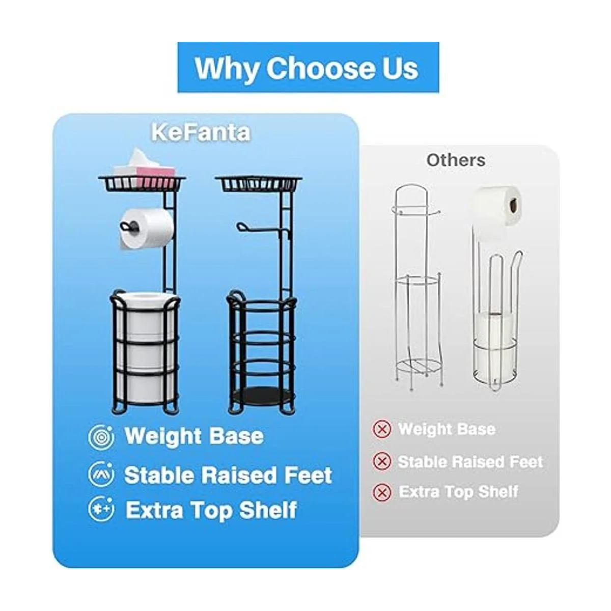 Estable y duradero El dispensador de papel higiénico está hecho de alambre de acero resistente con un moderno acabado negro a prueba de óxido que es simple y elegante. La base sólida con pies elevados mantiene el papel higiénico fuera del suelo mientras proporciona estabilidad adicional. Puedes colocar el rollo de repuesto dentro de la cesta para mayor estabilidad y equilibrio.