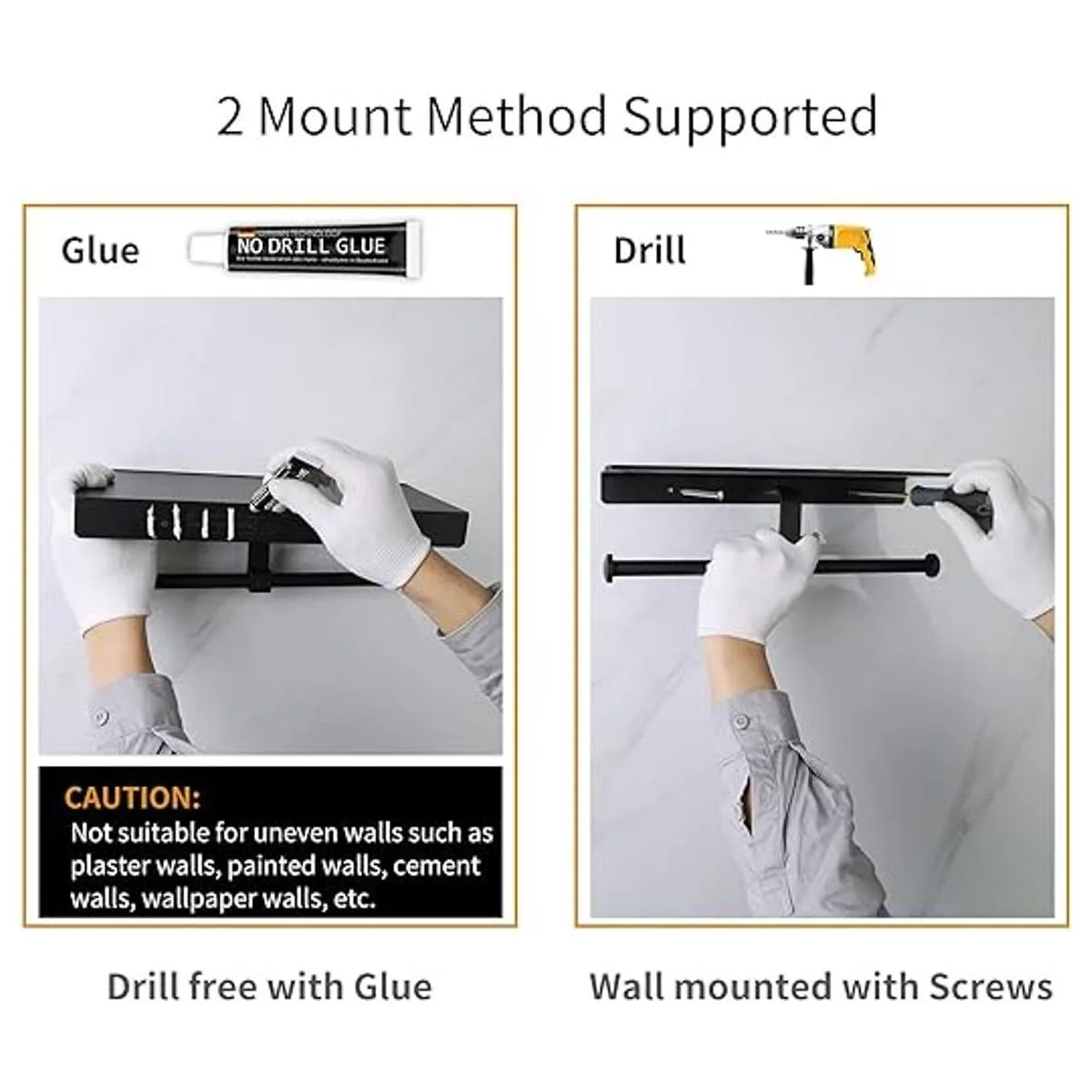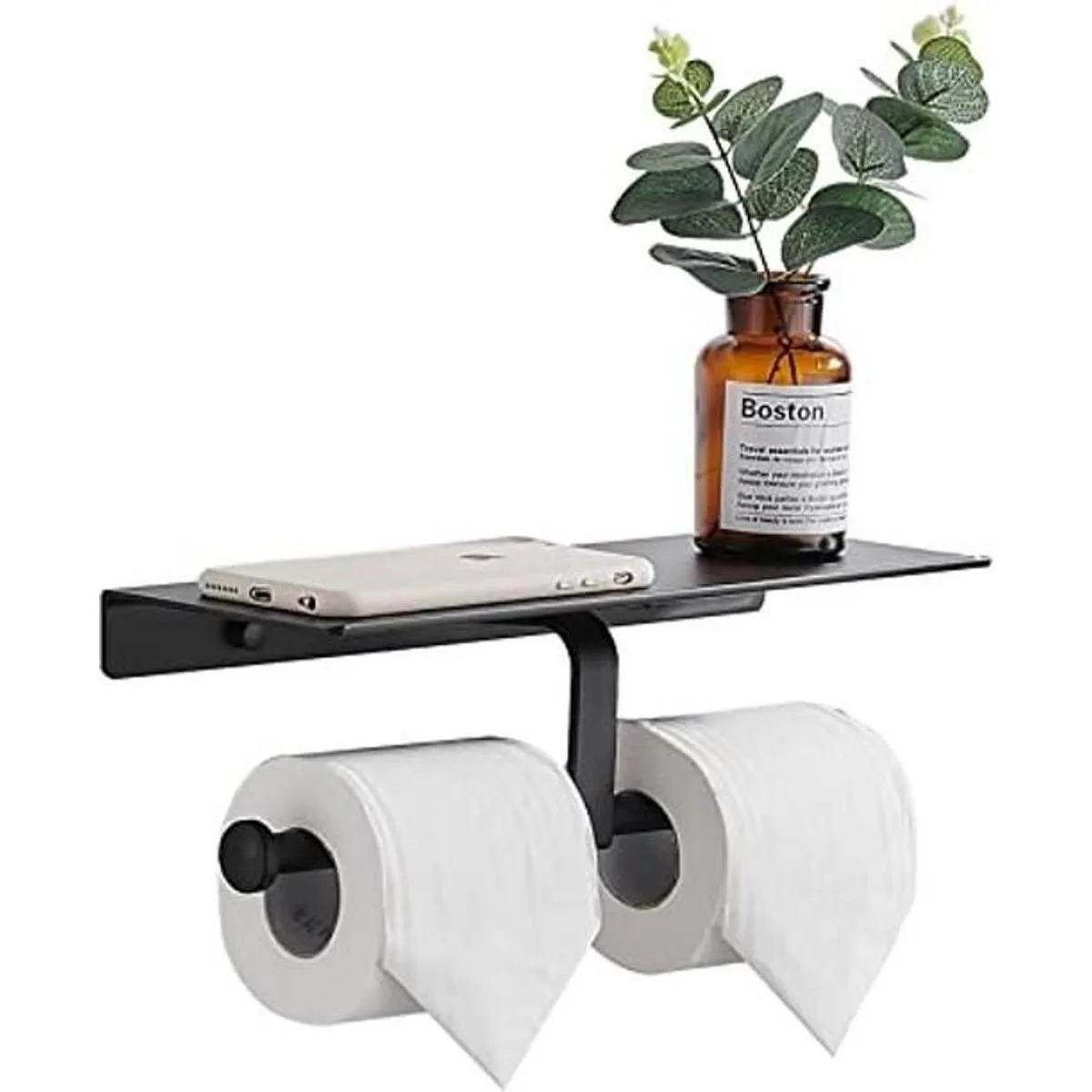 Soporte de papel higiénico negro mate con estantedoble rollo, dispensador comercial de papel higiénico con estante de almacenamiento para toallitas, tejidos, teléfono celular. Montaje en pared con pegamento o tornillos, aluminio