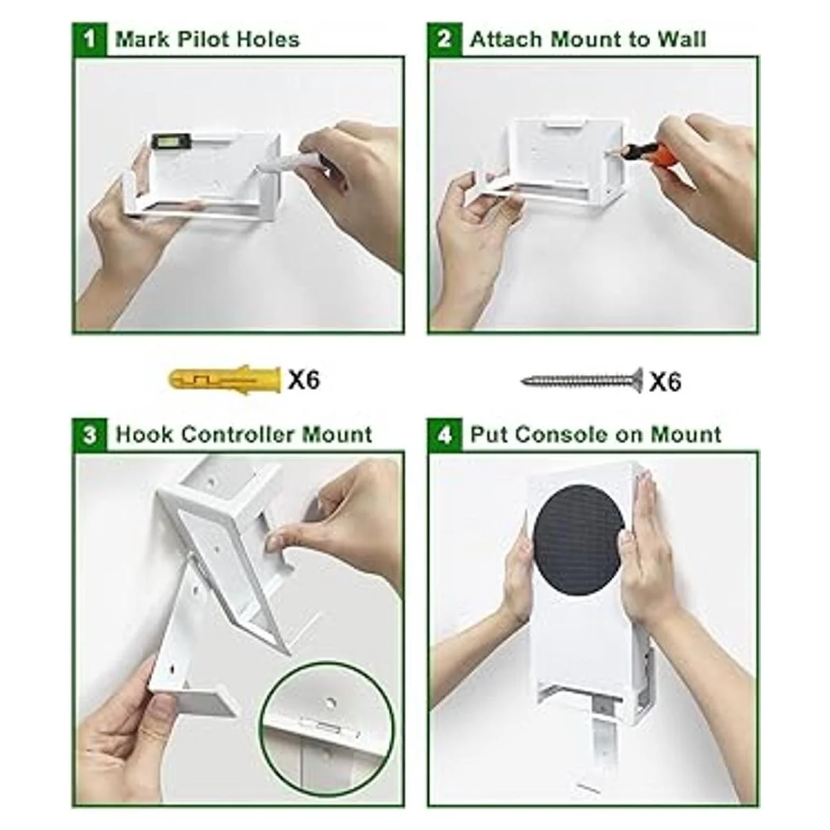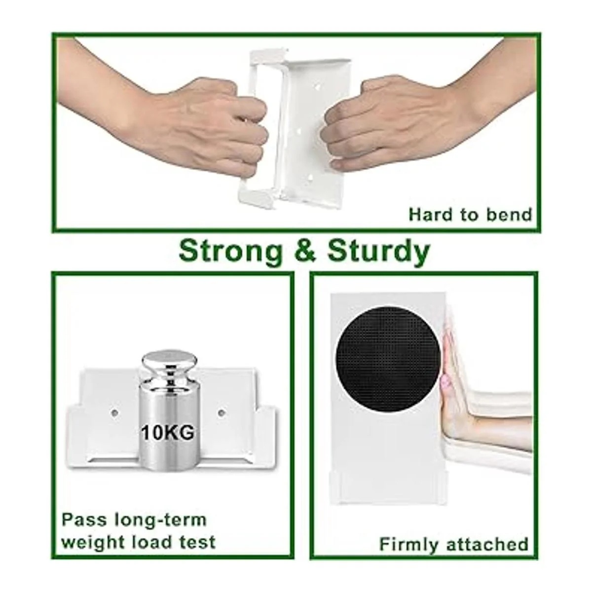 Fuerte y resistente: fabricado con materiales de acero resistente y acabado duradero con recubrimiento en polvo, lo que hace que el soporte de pared sea resistente y garantiza que la consola y el controlador montados sean estables y seguros sin arañazos, incluso evita la posibilidad de que la Xbox Series S se caiga causada por los niños pequeños o mascotas en casa