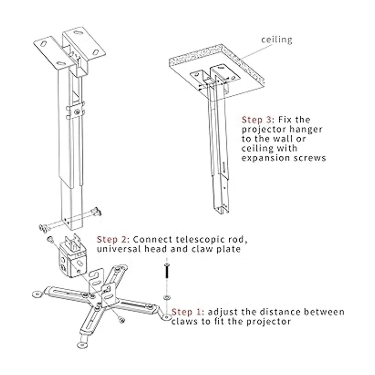 Fácil de instalar: el montaje en el techo del proyector ajustable es fácil de instalar con ganchos de liberación rápida que se fijan y desmontan apretando y aflojando los pernos de montaje. Se proporcionan todas las herramientas e instrucciones necesarias para el montaje. Nota: este soporte de techo para pantalla de proyector no soporta el techo abovedado ni los paneles de yeso normales.