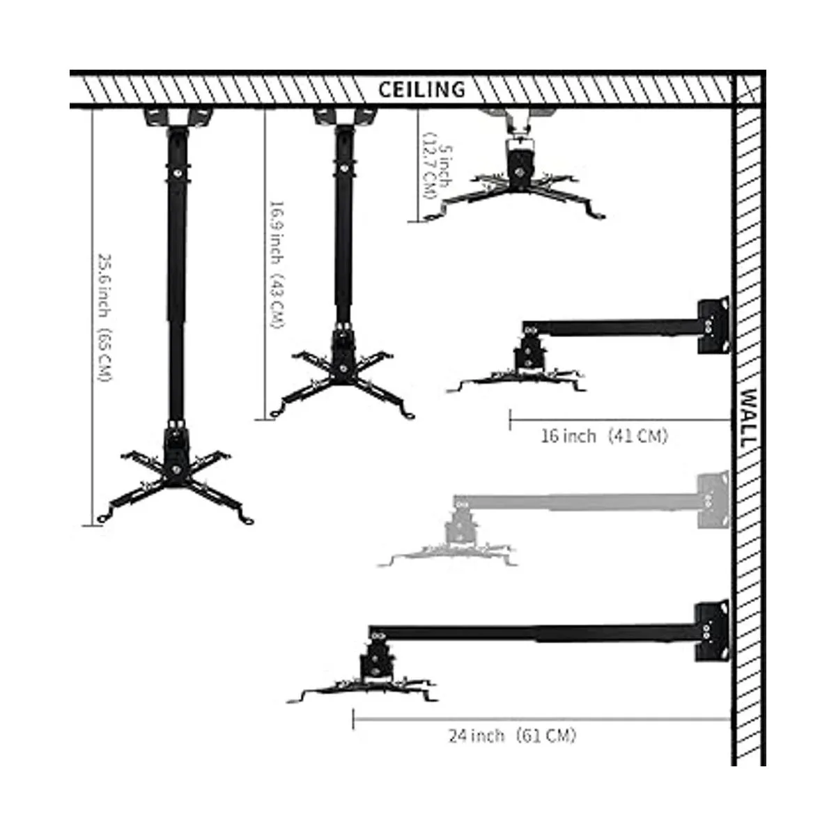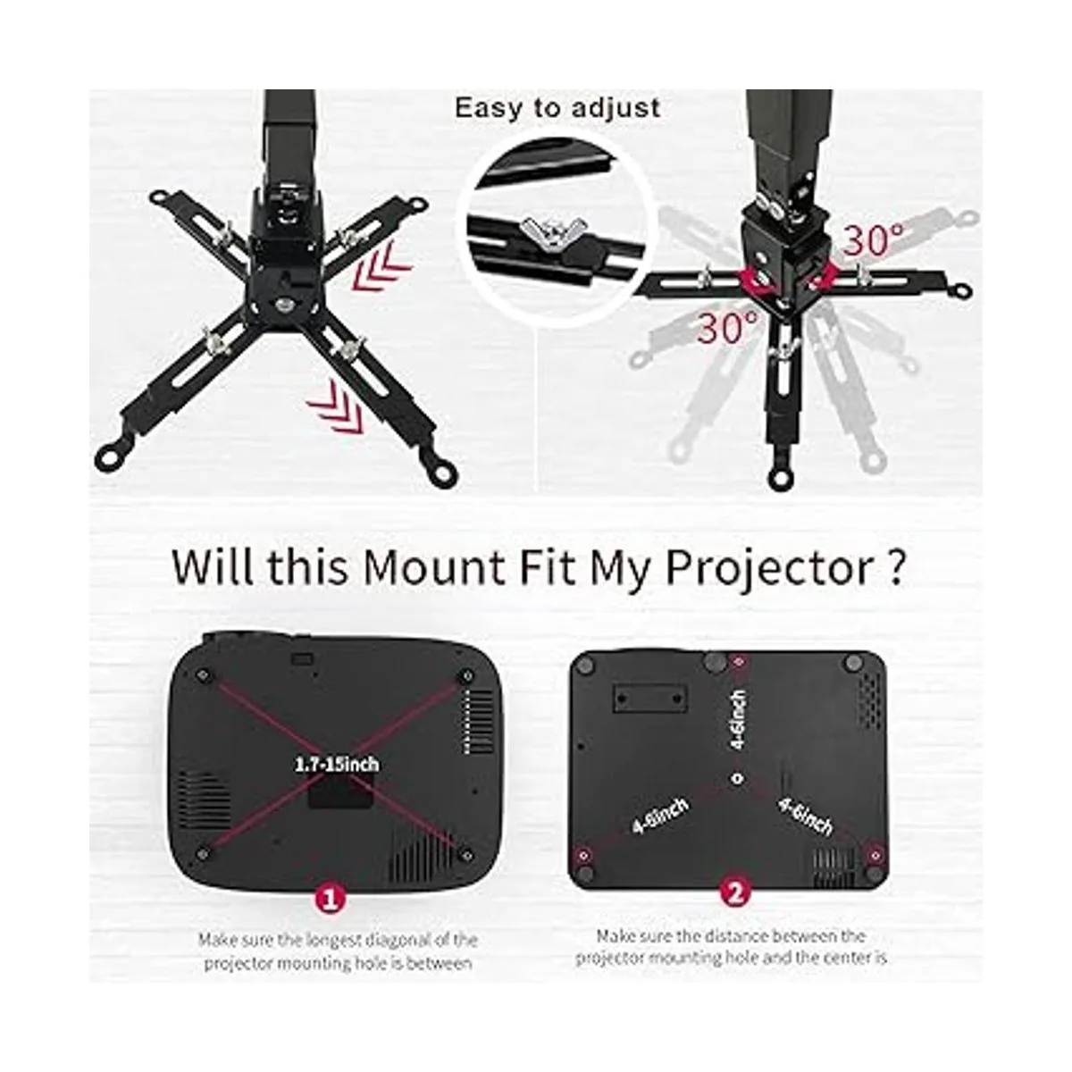 Fácil de ajustar: el soporte para proyector es totalmente ajustable con inclinación de / 30 grados, giro de /30 grados, golpeando todos los ángulos de visión correctos. La altura ajustable del soporte de techo del proyector se extiende de 16.9 a 25.6 pulgadas desde la superficie del techo y de 13.8 a 22.5 pulgadas de la pared. Soporte de techo empotrado con una longitud mínima de 5 pulgadas.