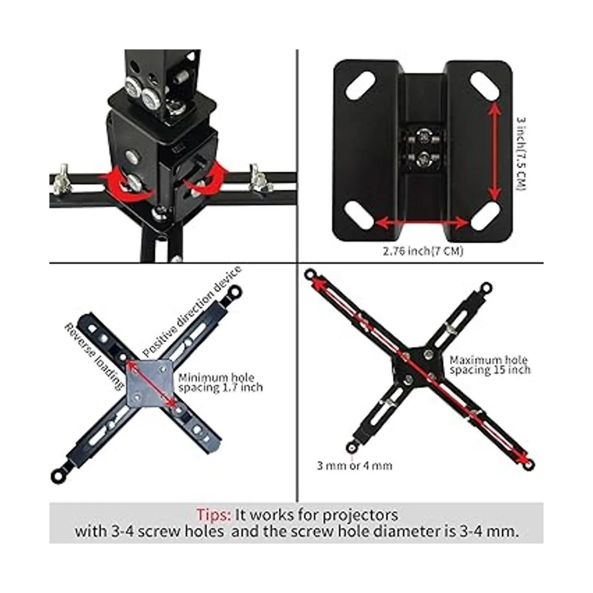 Nota: el soporte del proyector utilizado en este soporte del proyector debe tener las siguientes condiciones: 1. La pared donde se instala el soporte debe ser una pared sólida dura, no una pared hueca y débil; 2. El proyector tiene 34 agujeros para tornillos para instalar tornillos; 3. El diámetro de los agujeros de los tornillos es de 0.118 in o 0.157 in.