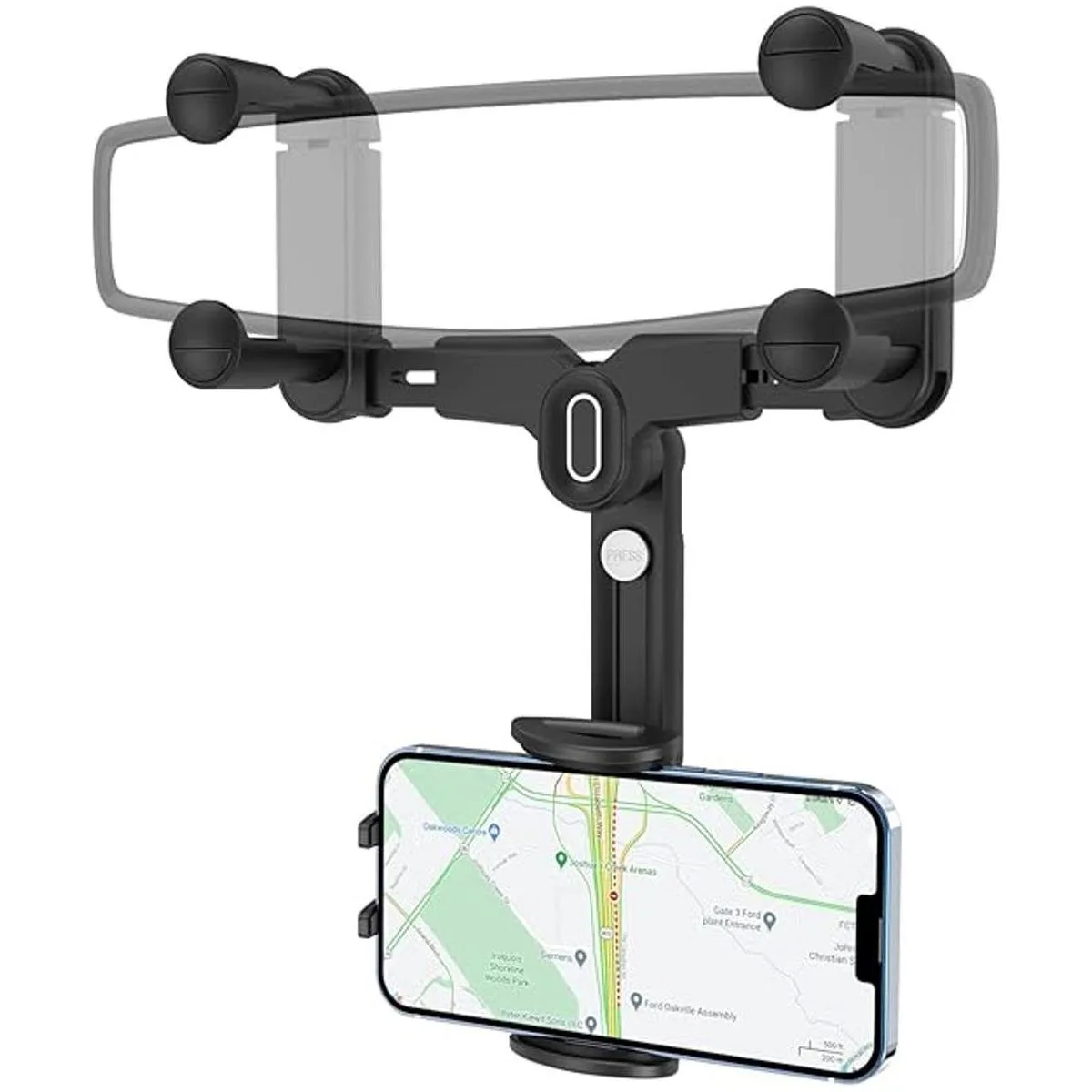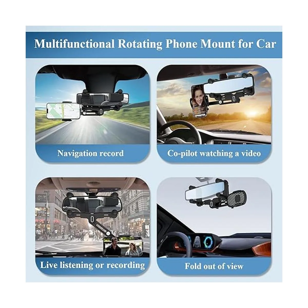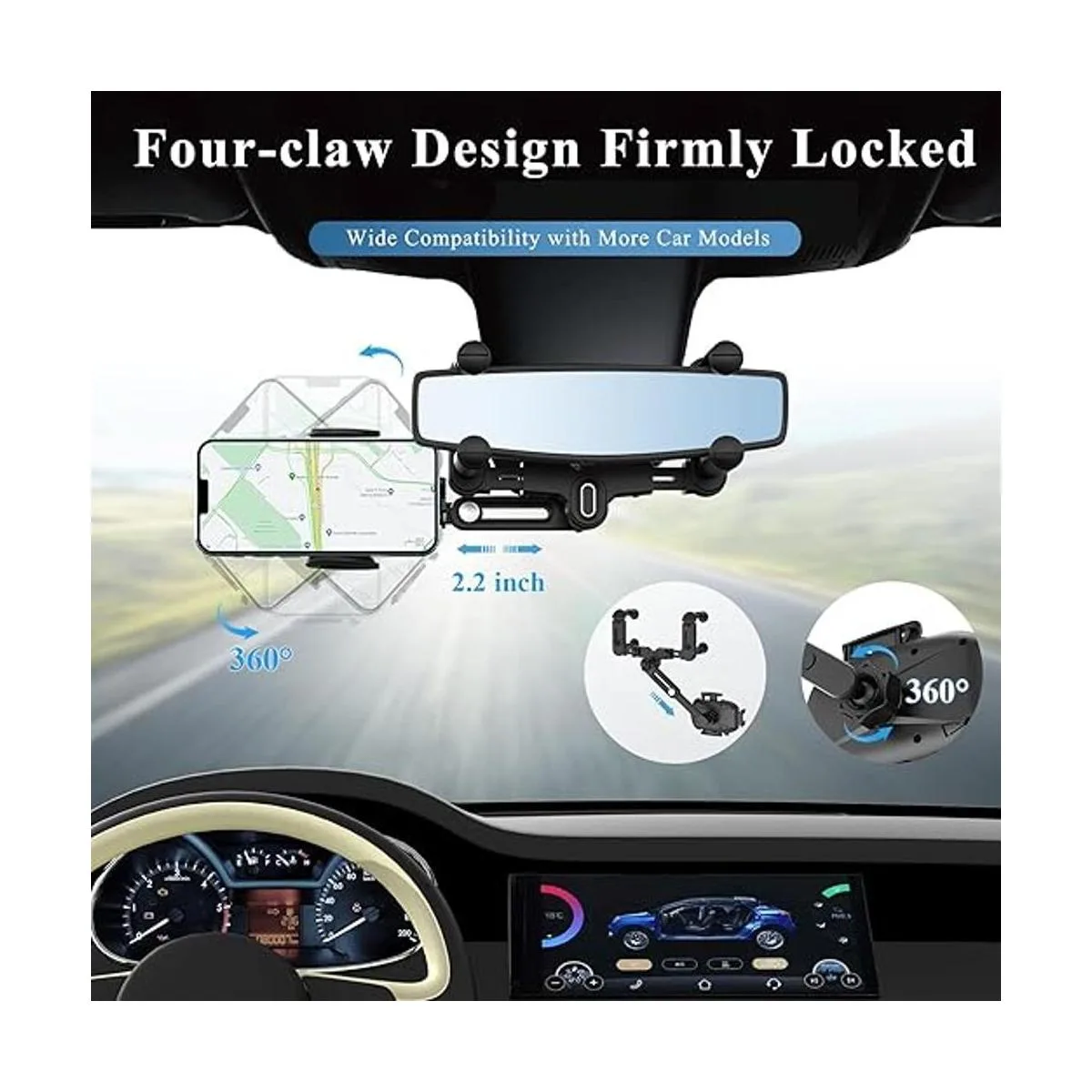 Diseño de cuatro garras firmemente bloqueado: el soporte multifuncional para teléfono para coche adopta un diseño retráctil de cuatro garras que se puede fijar firmemente en el espejo retrovisor. No solo se pueden extender y acortar la altura y el ancho de la abrazadera del marco, sino que también se pueden telescópico 4 deslizadores para adaptarse a diferentes tamaños de espejos retrovisores. Este soporte para teléfono de coche tiene un gran equilibrio y estabilidad, mantiene el teléfono firmemente en su lugar sin importar en la carretera o carretera de montaña con baches para evitar que se caiga.