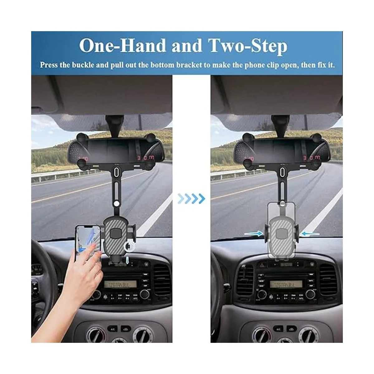 Funcionamiento con una sola mano: puedes colocar o llevar el teléfono con una mano cuando conduces, simplemente conecta el clip de brazo de agarre extensible al espejo retrovisor para ajustar fácilmente el teléfono celular a pantalla horizontal o vertical. El soporte para teléfono de coche se fija de forma segura al nivel de los ojos para eliminar la necesidad de mirar hacia abajo la navegación sin distracciones, disfruta de una conducción más relajada y segura. Cuando no está en uso, el soporte de teléfono para coche también se puede almacenar detrás del espejo, lo que no interfiere con la línea de visión.