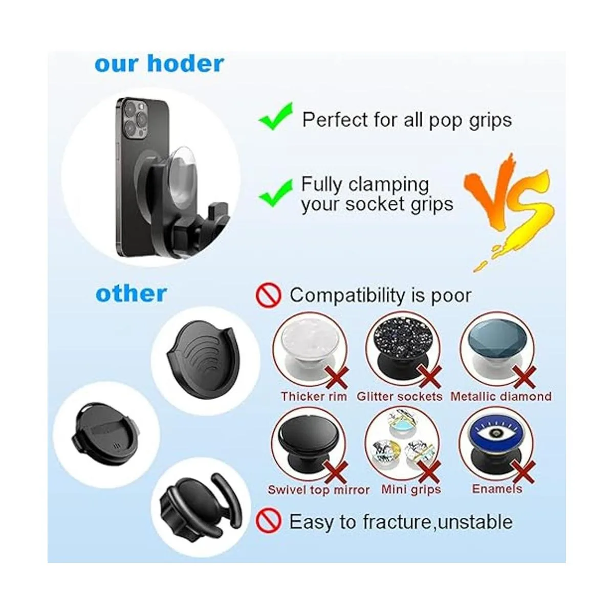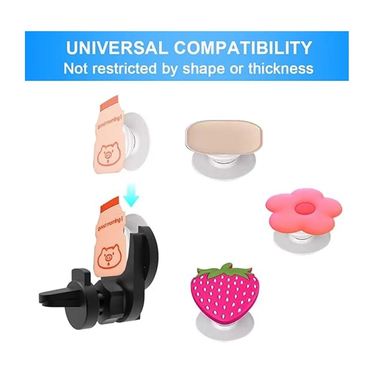 Soporte mejorado para la mayoría de agarres plegables: soporte de silicona para coche que se adapta a la mayoría de agarres plegables, incluyendo versión antigua, nueva versión básica y versión premium. Nuestro soporte también se adapta a agarres de enchufe con parte superior intercambiable como versión premium con parte superior intercambiable de diamante metálico/brillantina/polvo de acetato o versión de lujo, pero no es compatible con mini empuñaduras. Los agarres plegables no están incluidos